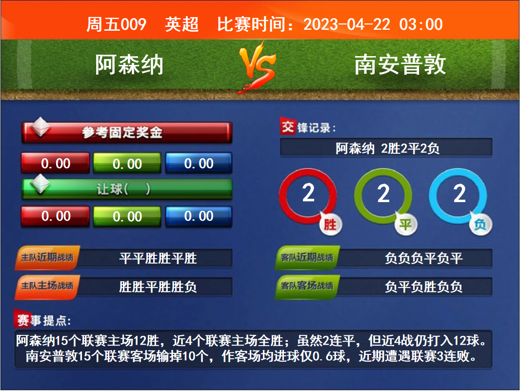 比赛时间:2023-04-22 03:00赛事提点:阿森纳15个联赛主场12胜,近4个联赛主场全胜;虽然2连平,但近4战仍打入12球。南安普敦15个联赛客场输掉10个,作客场均进球仅0.6球,近期遭遇联赛3连败。