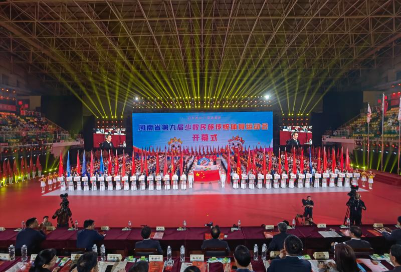 20时,河南省第九届少数民族传统体育运动会开幕式正式开始。在高昂激越的乐曲声中,护旗手高擎着鲜艳的五星红旗步伐矫健地走进会场。在国旗的引领下,本届运动会会旗、会徽和裁判员代表方队依次进入会场。随后,32个代表团的运动员精神抖擞,阔步走来,行进中30秒的驻停表演展示出本届民族运动会的绚丽多姿,令观众印象深刻。各方队斗志昂扬、朝气蓬勃的精神状态,显示出全省各族人民携手同奋斗、同心共筑梦的豪迈和激情。