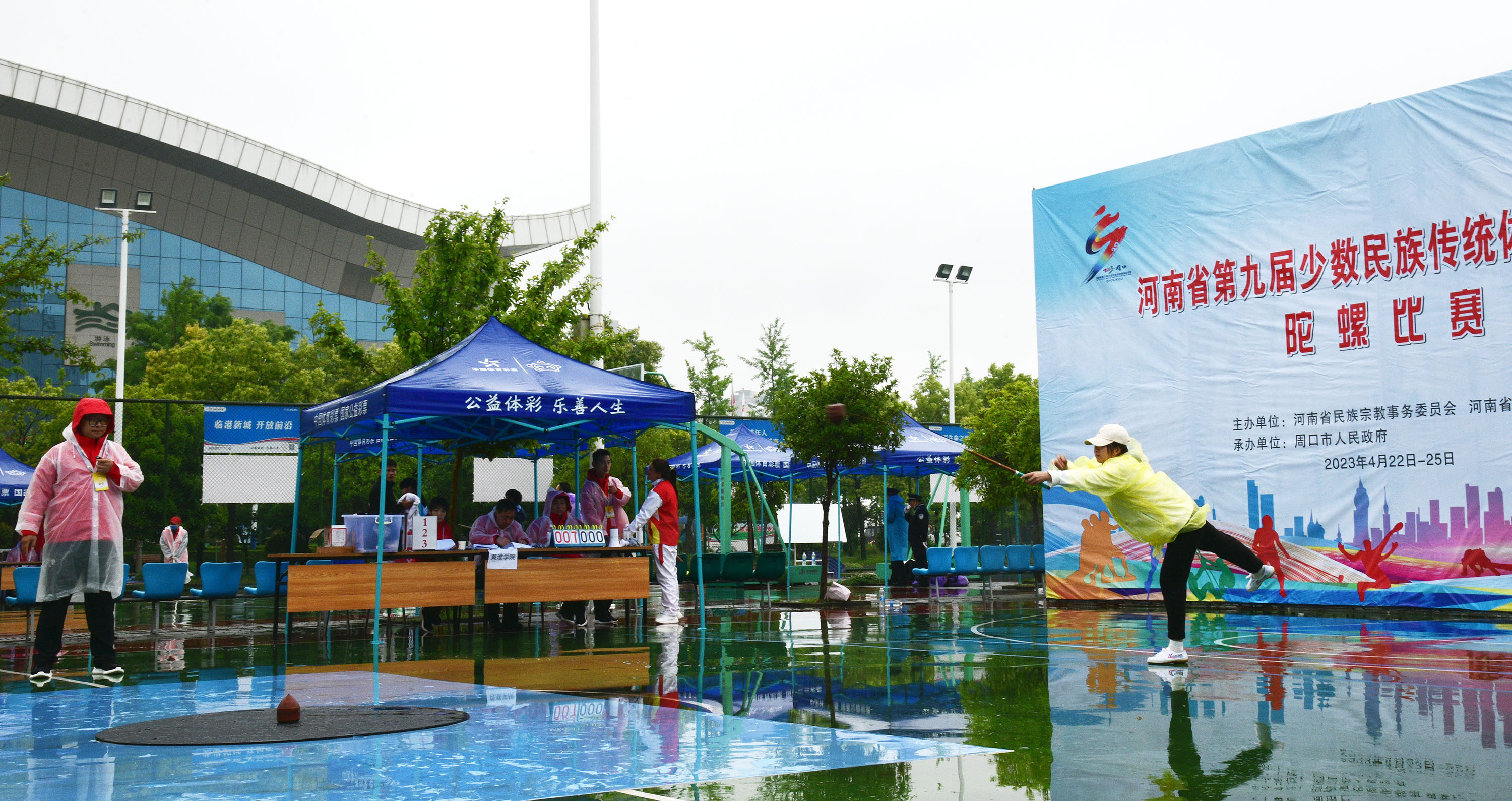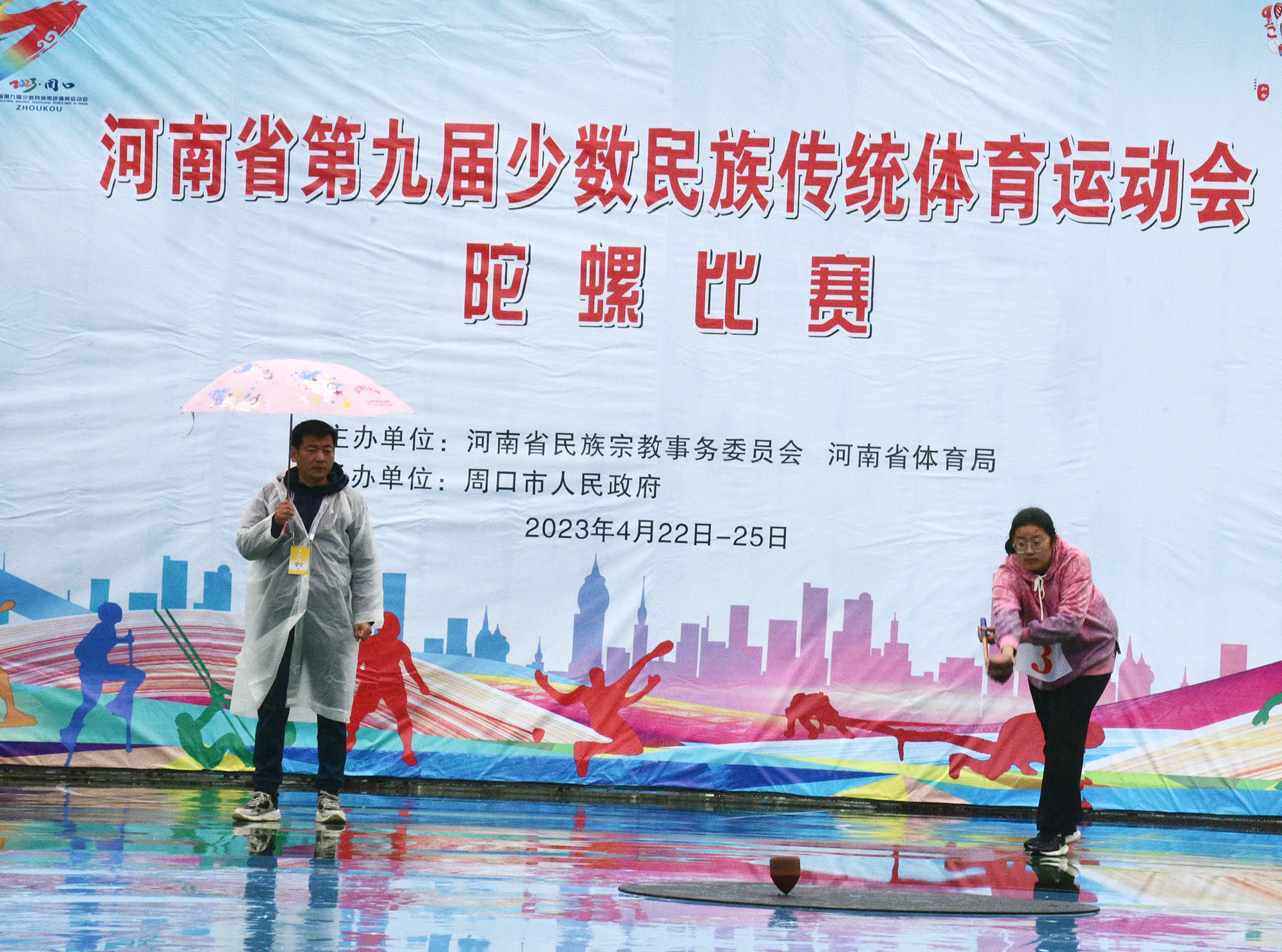 4月23日上午,河南省第九届少数民族传统体育运动会开赛。图为在市体育中心进行的板鞋竞速和陀螺比赛。记者 梁照曾 摄