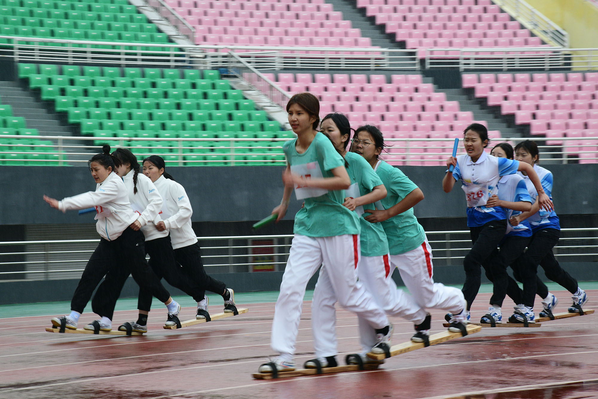 参加板鞋竞速的女子组比赛火热进行中 记者 梁照曾 摄