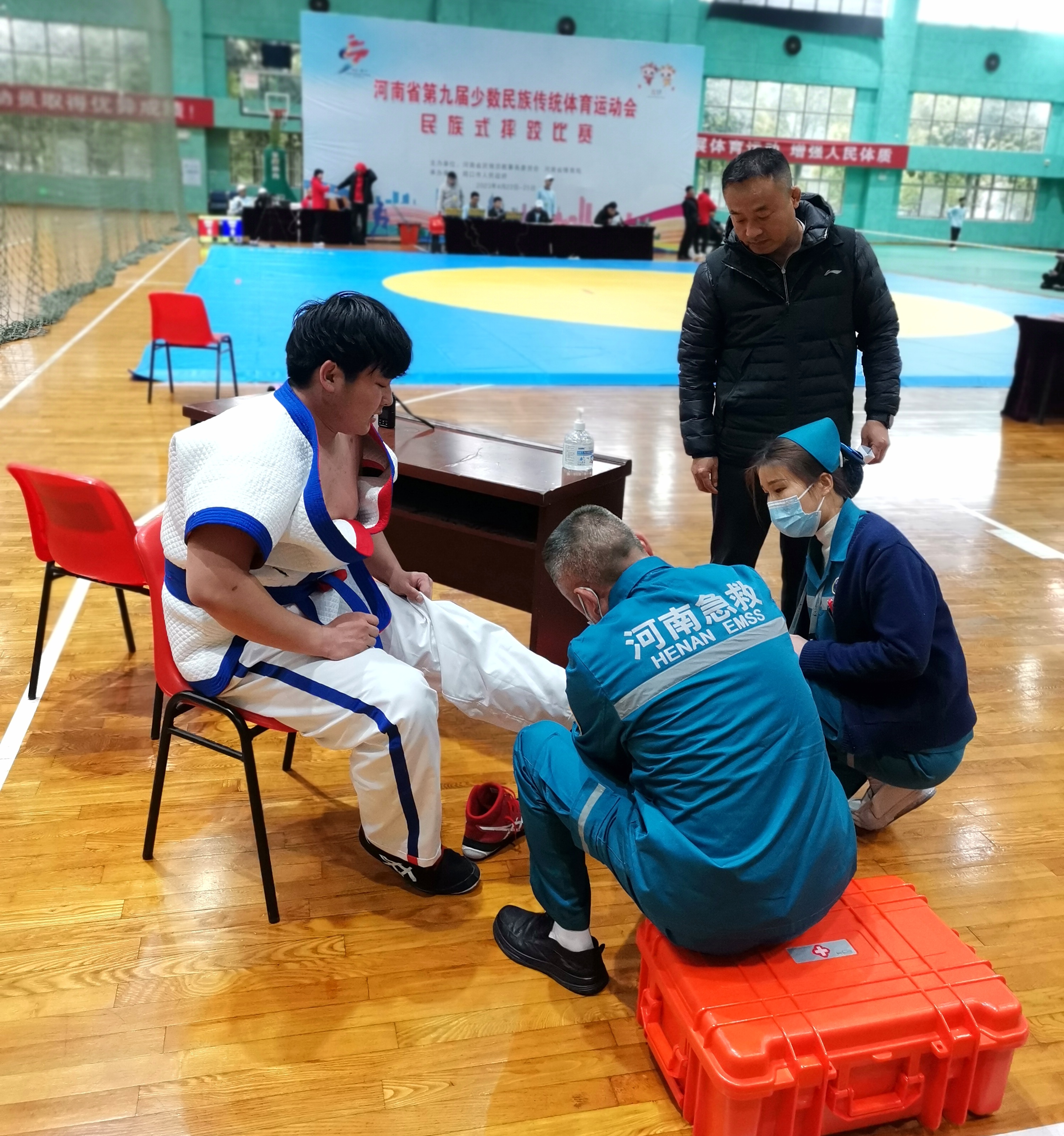 4月22日至26日,河南省第九届少数民族传统体育运动会在周口市举办。为确保来宾、运动员、教练员、技术官员等参会人员的医疗卫生安全,周口市卫生健康部门全面调动全市医疗资源,建立覆盖各竞赛项目及指定接待宾馆的医疗救治、卫生监督、防疫消杀等医疗保健服务体系,认真完善各项工作方案、预案,制定细化工作流程,为省运动会提供及时有效、热情周到的医疗卫生保障服务。图为运动员在比赛中受伤,现场保障的医护人员迅速处置。