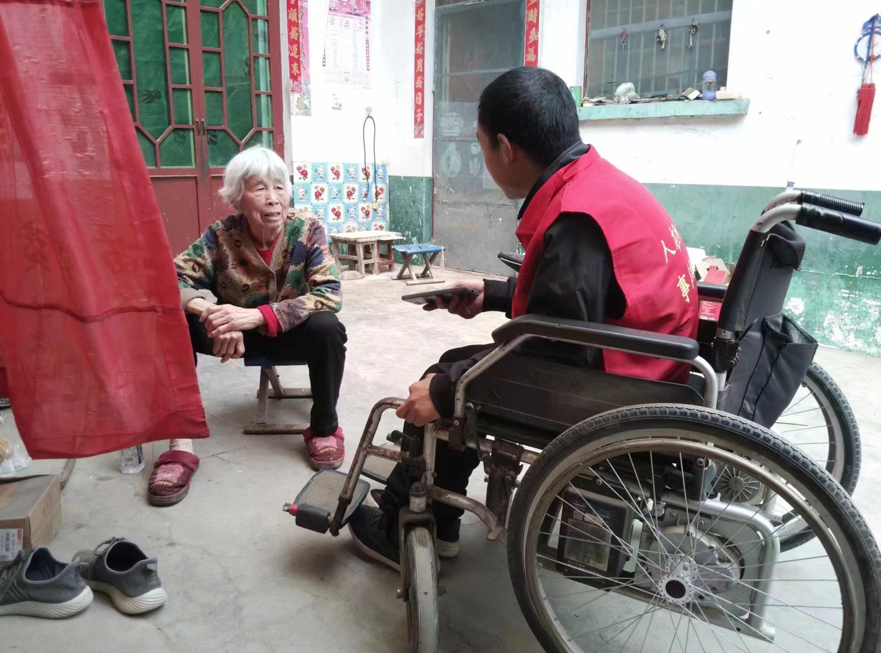 在西华县址坊镇蔡庄村,有一位靠轮椅代步的残疾人,走村串户关心着网格内居民的家长里短、急难愁盼。疫情防控、排查纠纷、各种保险缴纳信息录入、60岁以上老人的生存认证等工作,都有他忙碌的身影,他就是网格员——远凤朝。