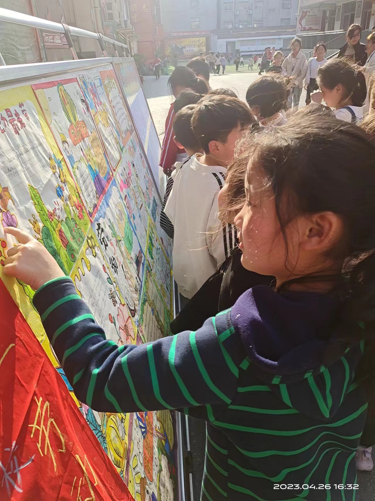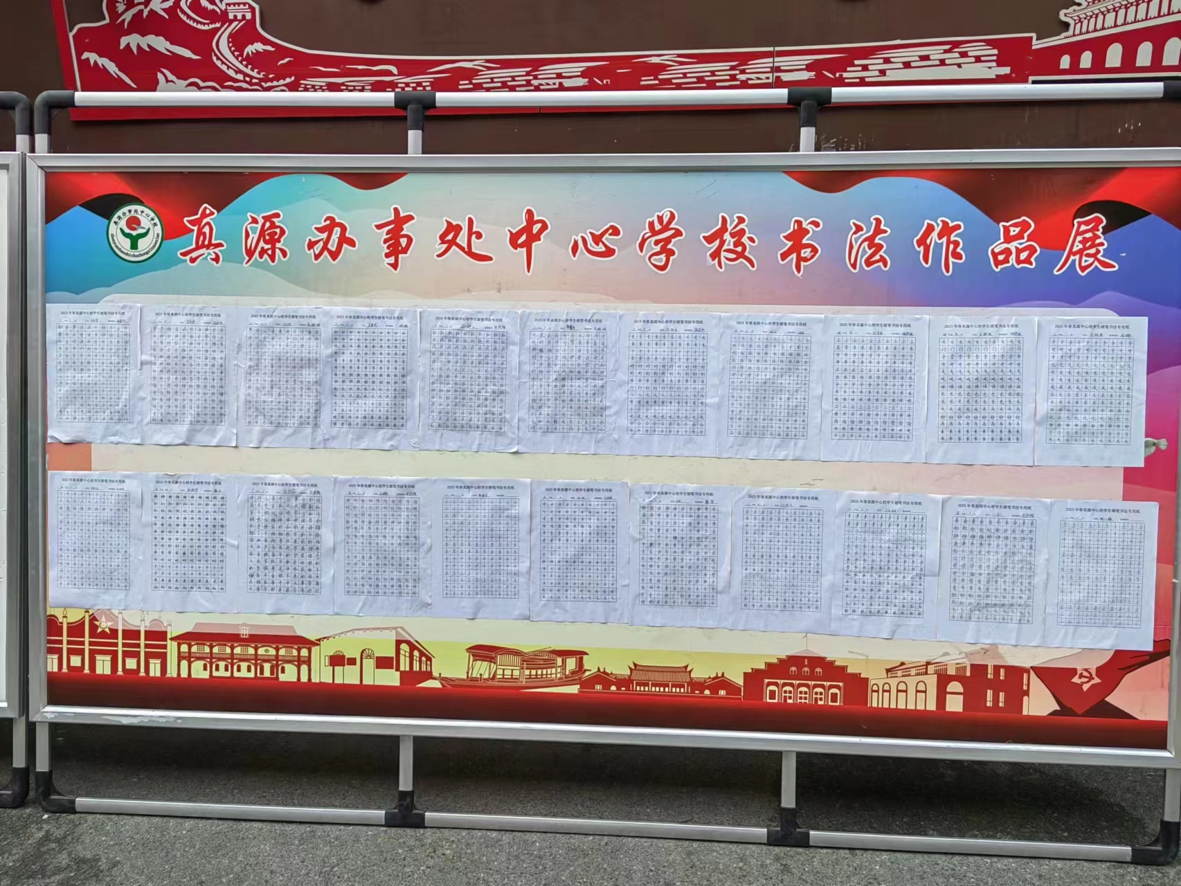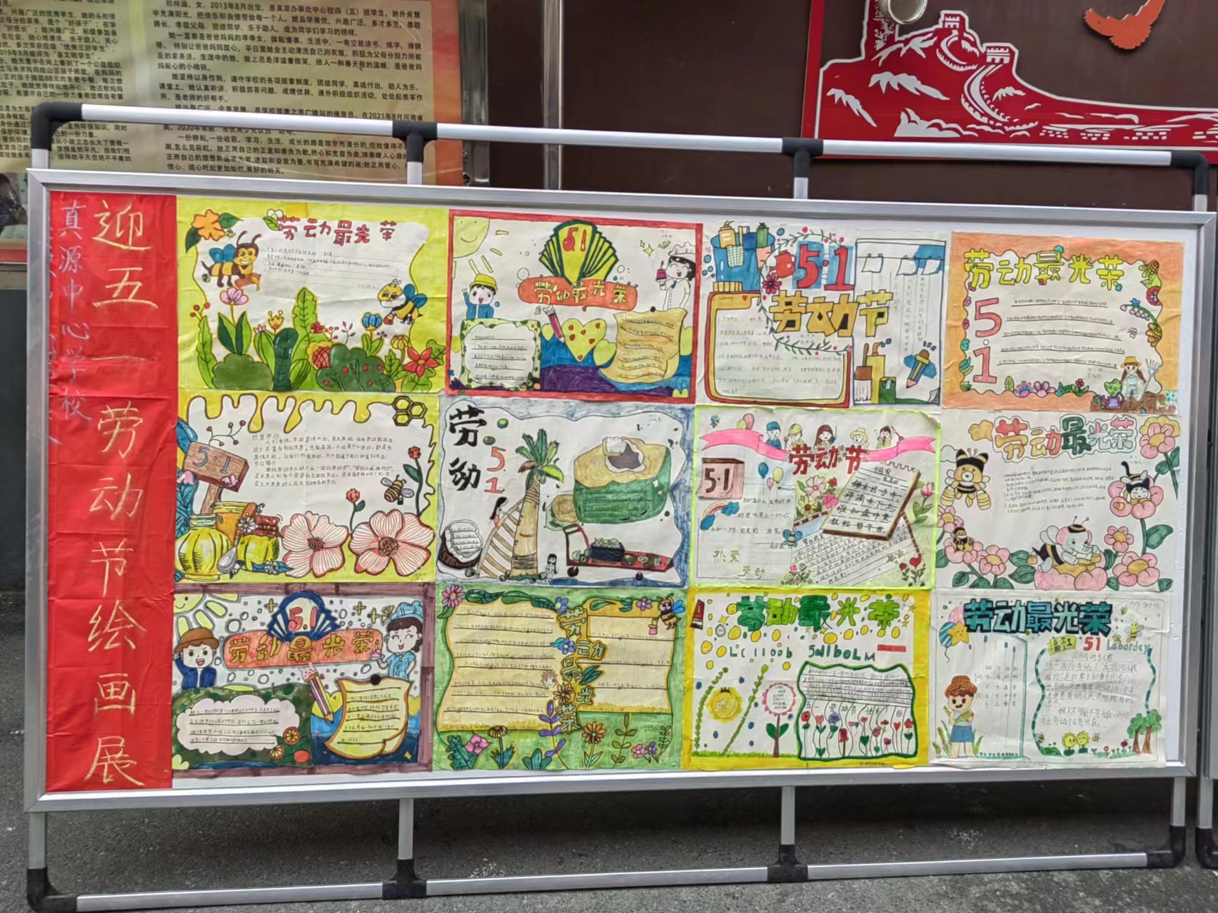 为庆祝“五一”国际劳动节,活跃校园文化生活,展示同学们的才艺,4月27日,鹿邑县真源中心学校在校园主干道边举办庆“五一”书画展。