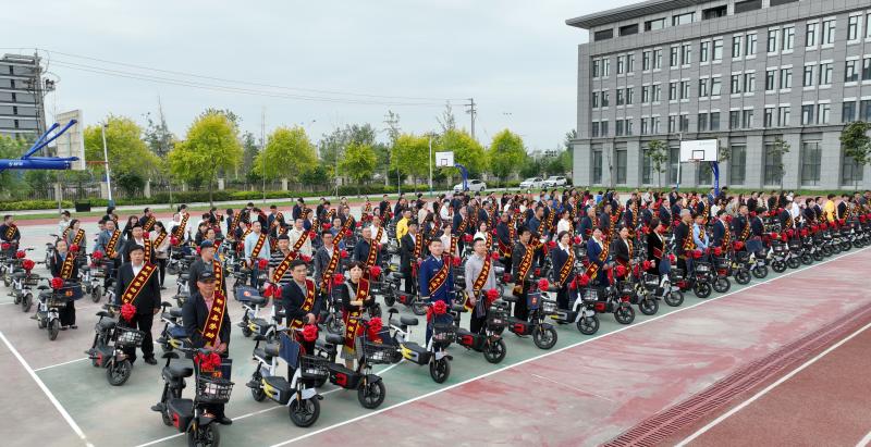 与会领导为获奖者颁发劳动模范奖章和荣誉证书,每人奖励一辆电动自行车。