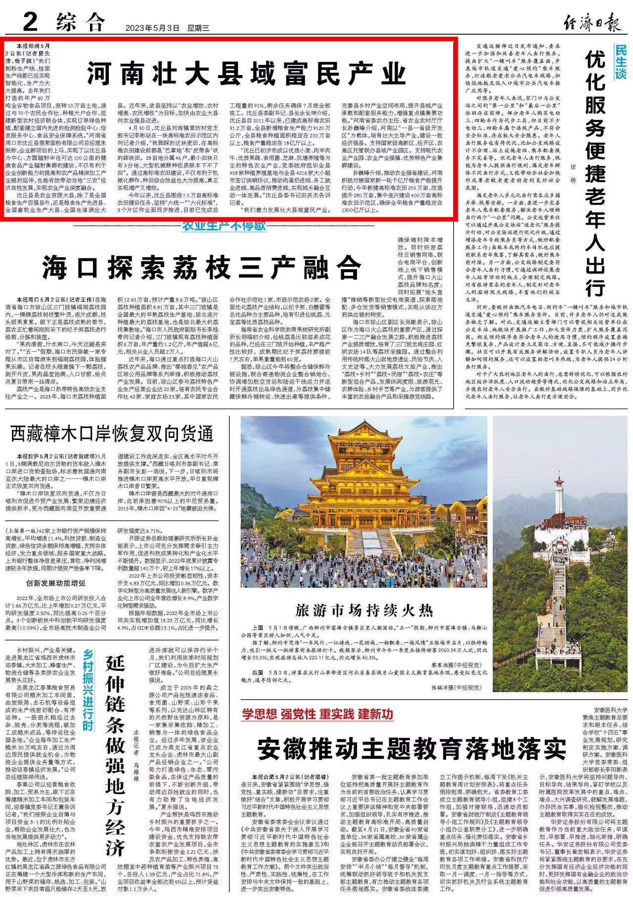 “我们着力发展壮大县域富民产业。完善县乡村产业空间布局,提升县城产业承载和配套服务能力,增强重点镇集聚功能。”河南省委农办主任、省农业农村厅厅长孙巍峰介绍,河南以“一县一省级开发区”为载体,培育壮大主导产业,建设一批经济强县。支持国家级高新区、经开区、农高区托管联办县域产业园区。支持现代农业产业园、农业产业强镇、优势特色产业集群建设。