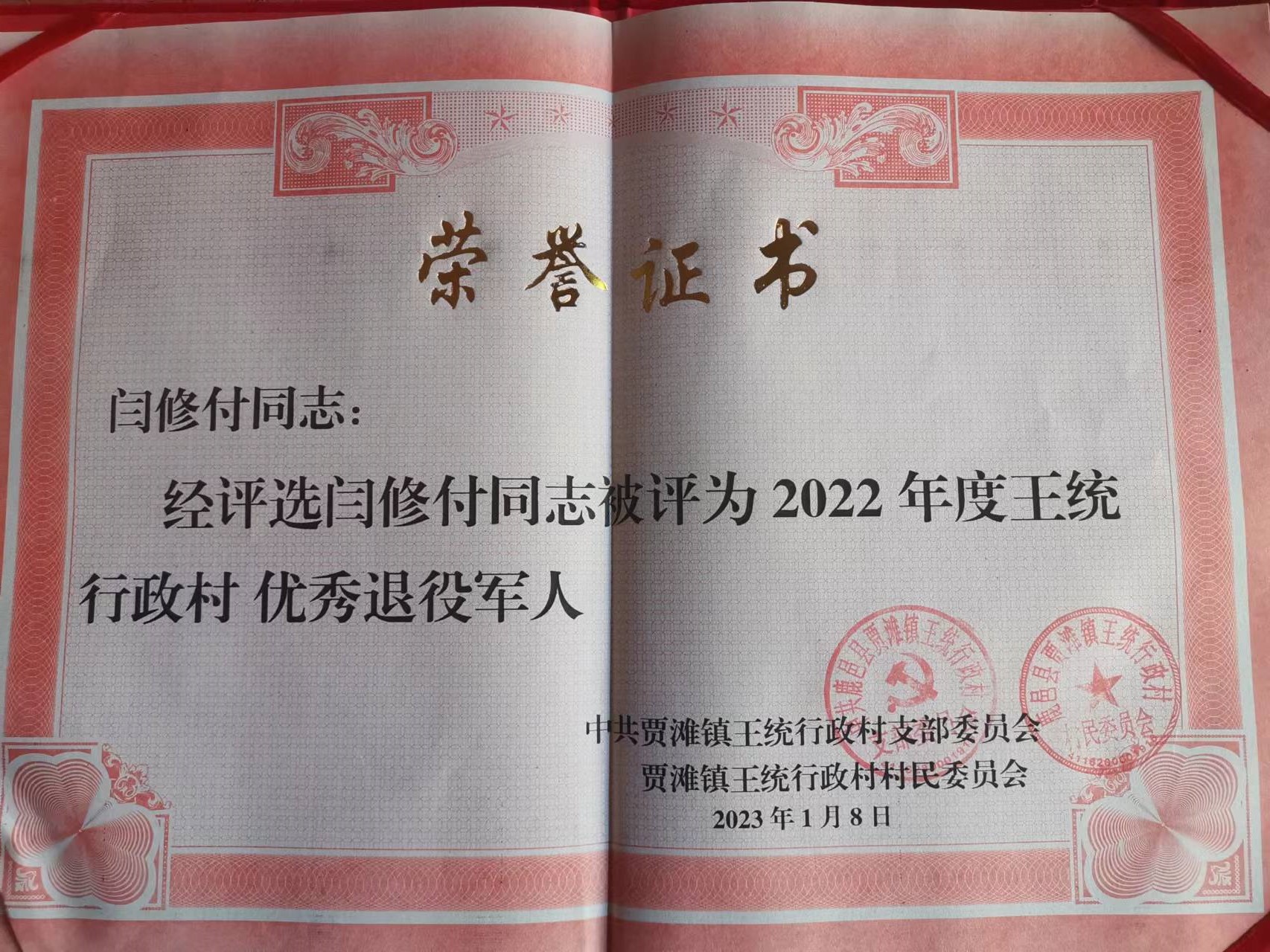 2019年春季,闫修付担任村护林员,不久前又担任了村干部。今年1月,闫修付被村党支部、村委会表彰为2022年度“优秀退役军人”。