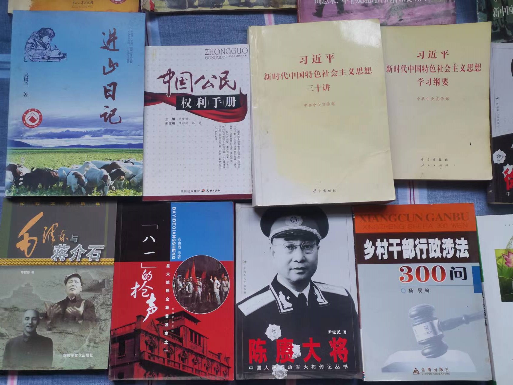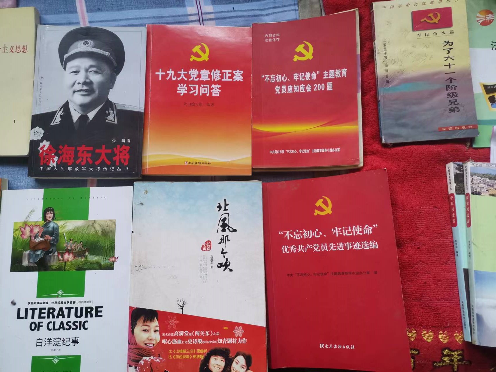 记者在闫修付家看到,他家东屋南侧靠近窗户处,整齐摆放着《习近平新时代中国特色社会主义思想学习纲要》《习近平新时代中国特色社会主义思想学习三十讲》《“不忘初心、牢记使命”主题教育党员应知应会200题》《“不忘初心、牢记使命”优秀共产党员先进事迹选编》《毛泽东与蒋介石》《陈赓大将》《徐海东大将》《北风那个吹》《白洋淀纪事》《“八一”的枪声》《进山日记》《为了六十一个阶级兄弟》《乡村干部心声涉法300问》《中国公民权利手册》《河南日报》《周口日报》《周口晚报》等书籍报刊。