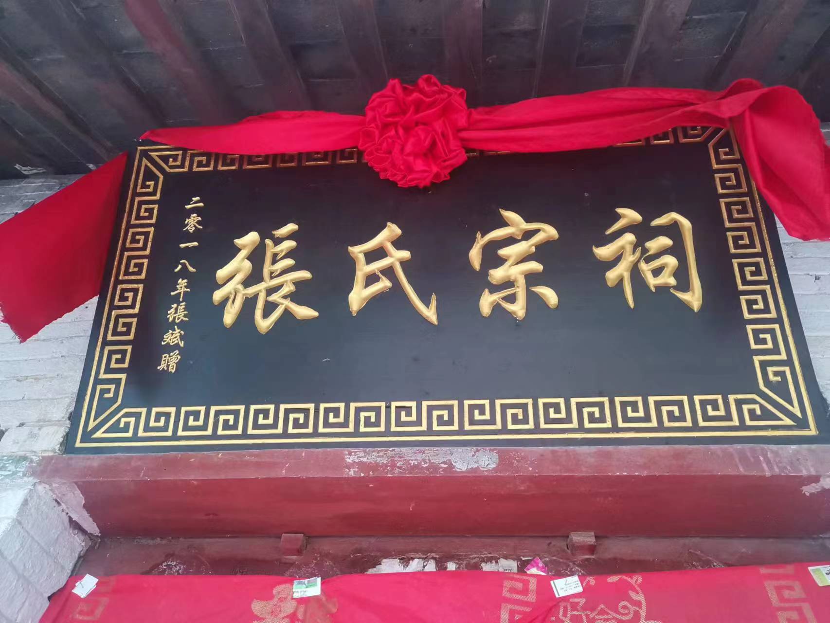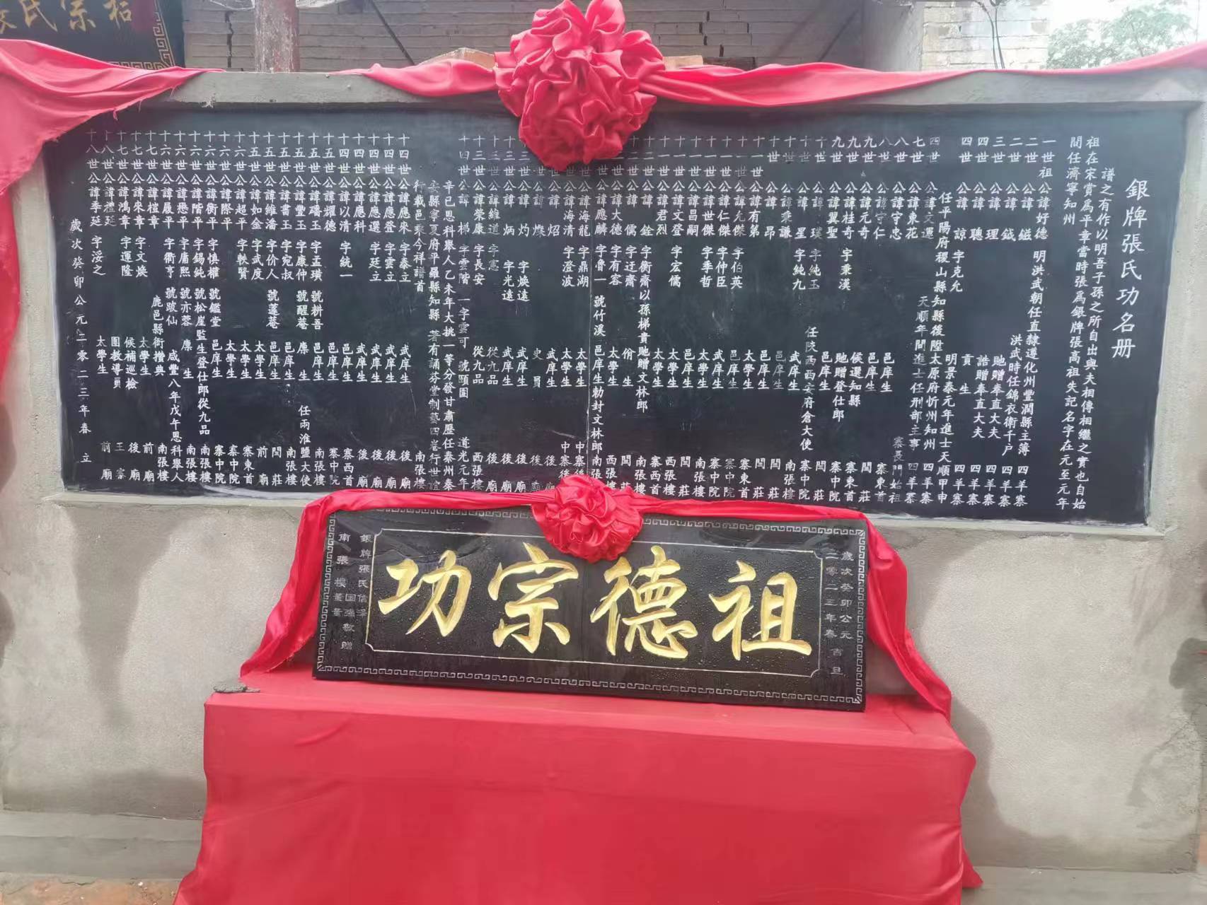 走进院内,映入眼帘的是上方悬挂着大红绣球的“银牌张氏功名册”石碑,下方书有“祖德宗功”四字方形小石碑。后面是三间古朴的宗祠建筑房屋,门上方石匾是2018年悬挂书有“张氏宗祠”黄色大字。走进屋内,正堂中间是一世祖至四世祖的四代神主牌位。