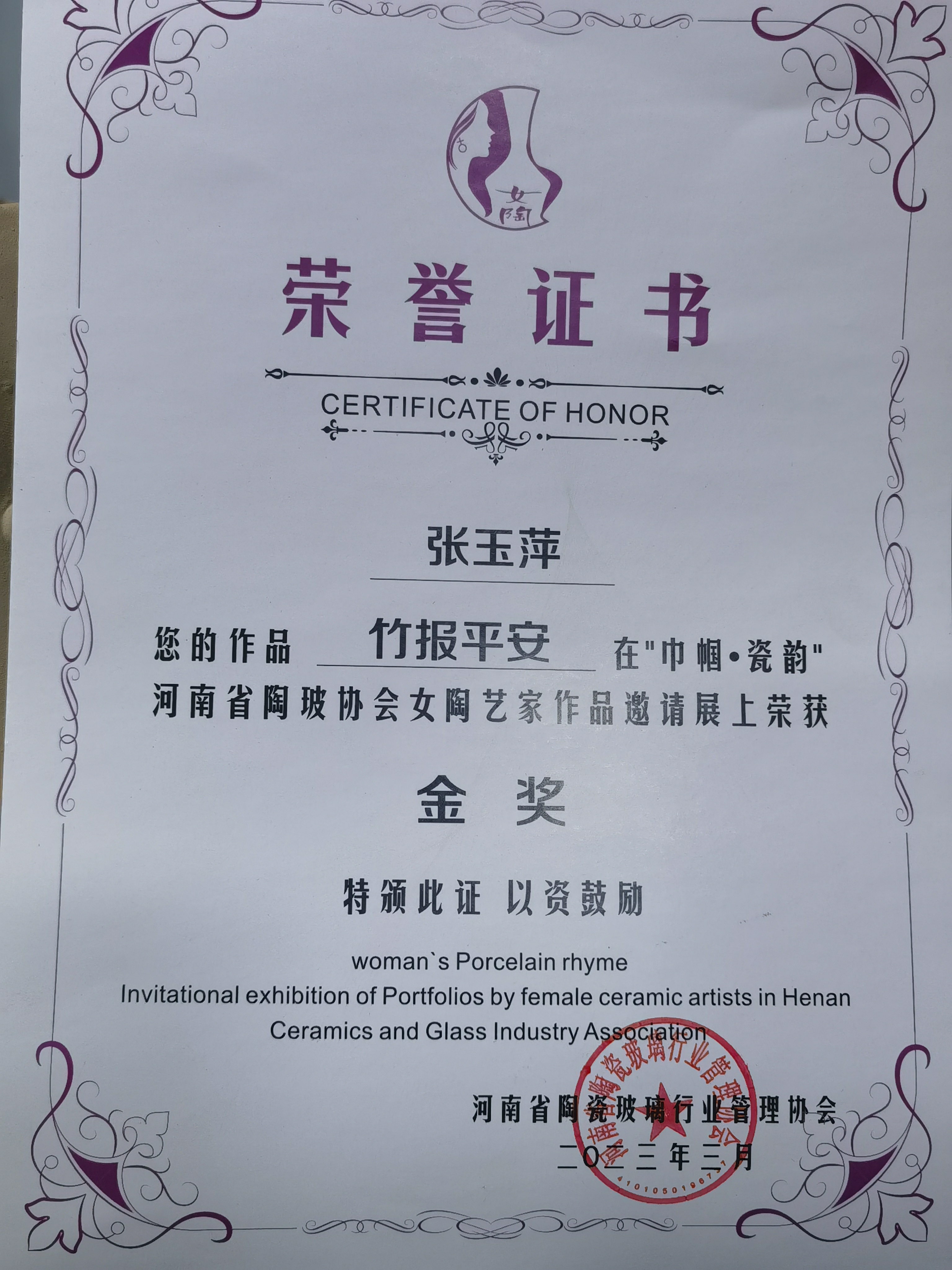 近日,郸城县第五实验中学青年美术教师张玉萍收到了一份特殊的荣誉——金奖证书和奖杯,其创作的陶瓷泥塑作品《竹报平安》荣获“巾帼•瓷韵”河南省陶玻协会女陶艺家作品展金奖。