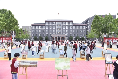 上午,由艺体部师生创作的一百余幅水粉、油画、素描等书画作品整齐地排列在青春广场,吸引了众多师生的注目观看。在广场两侧,学生现场作画,将观众带入优美的艺术世界。