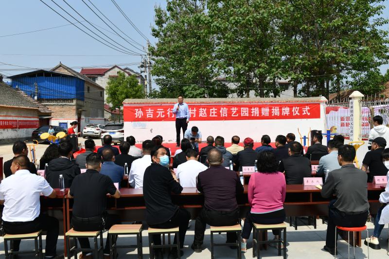 5月12日上午,鹿邑县贾滩镇在孙吉元党群服务站隆重举行孙吉元行政村赵庄信艺园捐赠揭牌仪式。省政协常委、农业和农村委员会副主任张继敬,省水利厅原巡视员梁再培,省市场监督管理局原总工程师徐西河,省审计厅原副厅长解鹏里等及知名企业负责人、当地村民参加揭牌仪式。