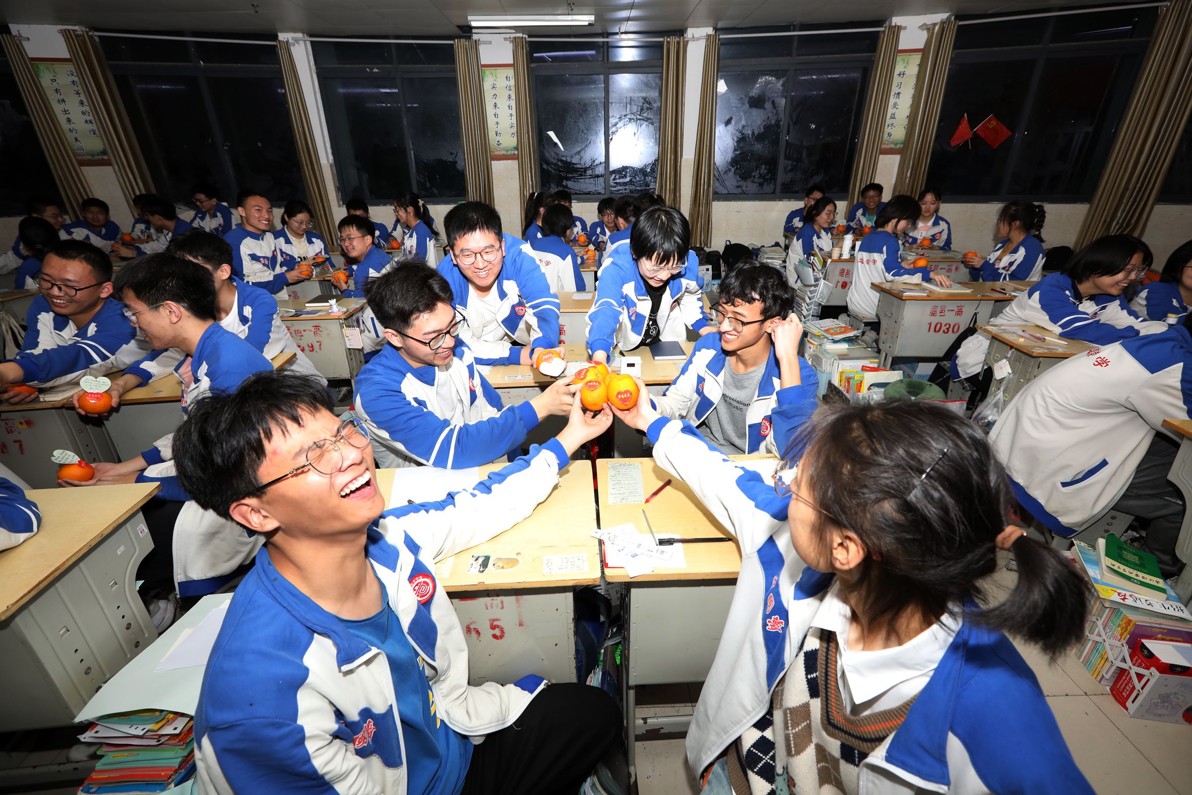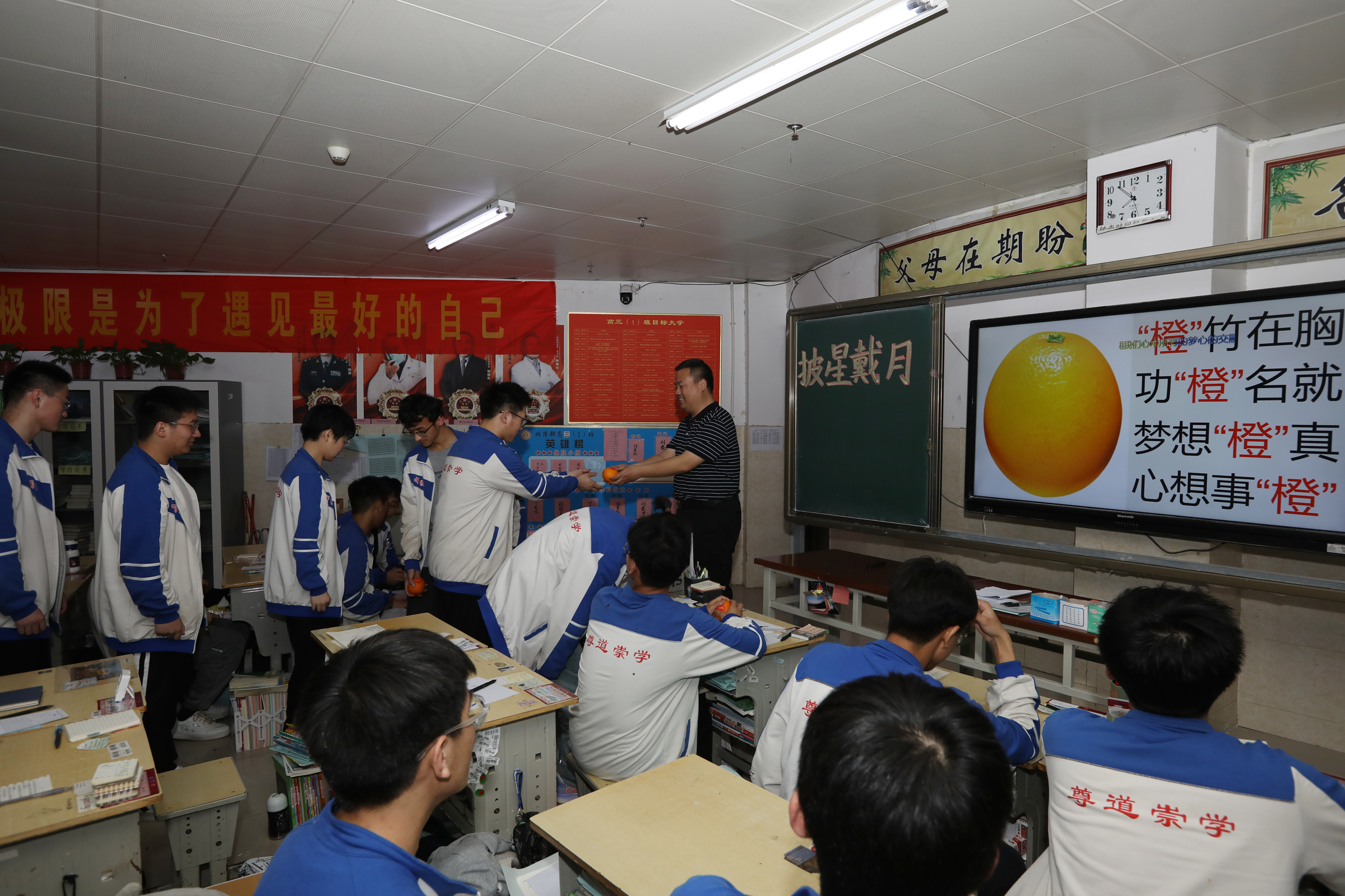 当班主任把学校为每一位同学准备象征着“‘橙’竹在胸、功‘橙’名就、梦想‘橙’真、心想事‘橙’”的橙子发放到学生手中,班会氛围达到最高潮。