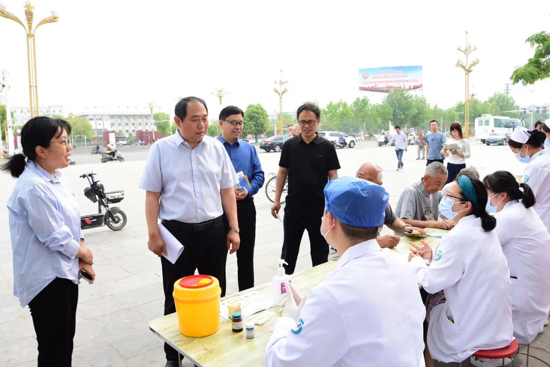 5月18日,在第34个“5·20”中国学生营养日到来之际,郸城县卫健委组织四大医健集团和县疾控中心在世纪广场举行中国学生营养日义诊宣传活动。郸城县卫健委副主任徐涛、李梦,县疾控中心主任张吉志、副主任陈玉峰到现场查看活动开展情况。