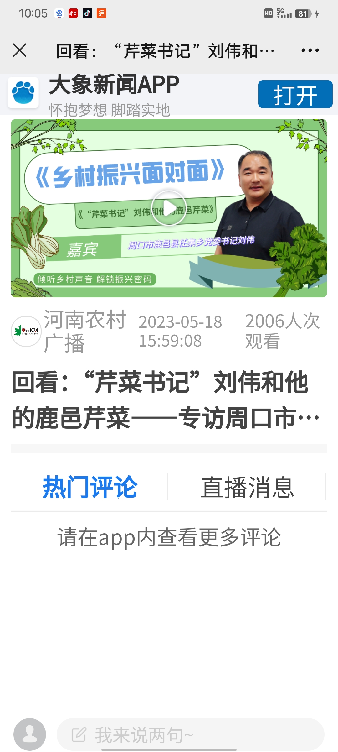 应河南广播电视台《乡村振兴面对面》栏目之邀,5月18日,鹿邑县任集乡党委书记刘伟赶到河南广播电视台,利用现场直播方式,与全省观众面对面,介绍任集乡美丽乡村建设经验。