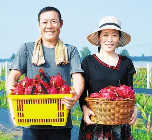 盛夏时节,万木葱茏。在太康县清集镇梦里田园火龙果种植基地,一株株仙人掌状的火龙果成行排列,一个个饱满的火龙果如火焰般垂挂枝头。打扮利落的刘秀英边用手机拍摄火龙果果皮上黄绿相间的鳞状花萼,边向粉丝介绍火龙果的长势和收成情况。