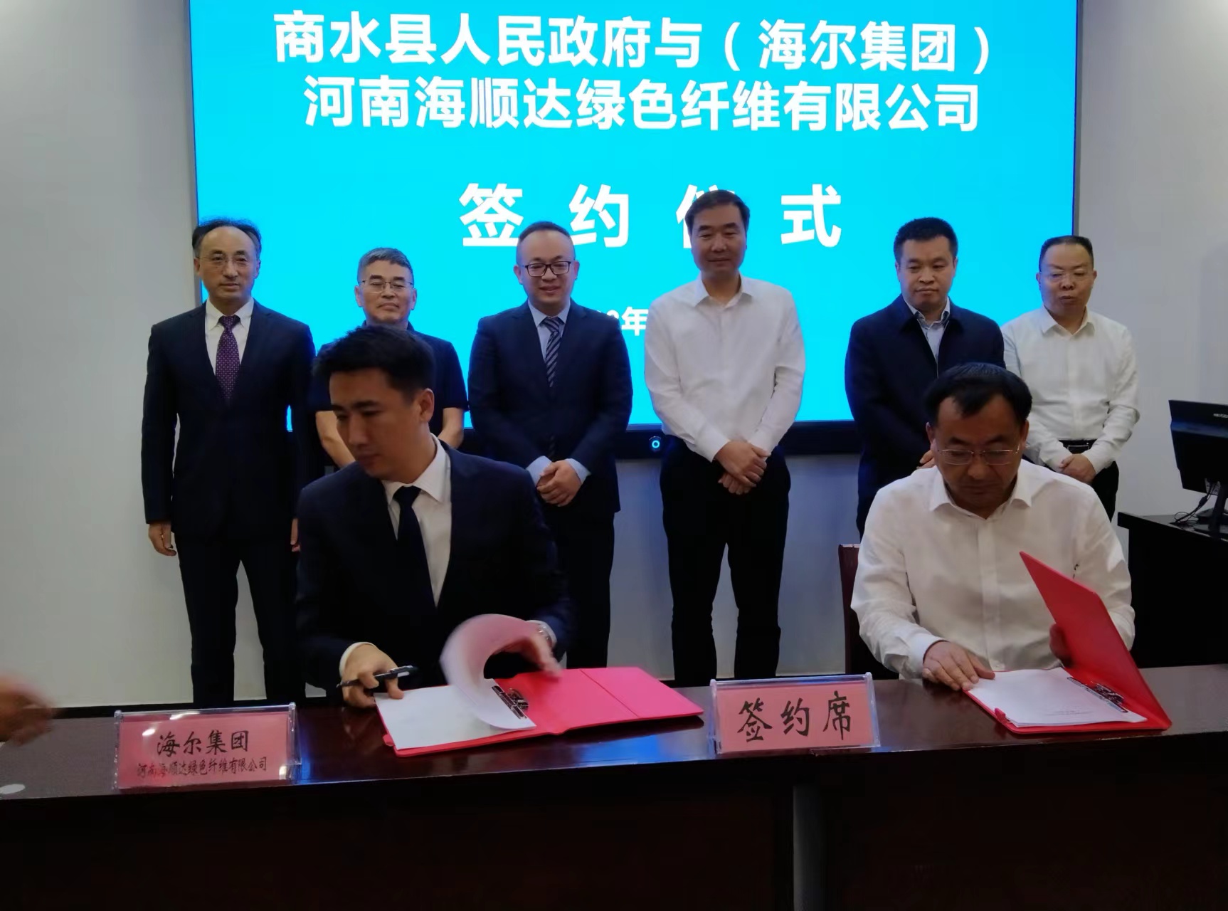 5月26日,商水县委县政府与(海尔集团)河南海顺达绿色纤维有限公司签约仪式在县委二楼会议室举行,商水县委书记孔阳,县委副书记、县长沈宗祥,县委常委、办公室主任段然,县政府副县长王宾,海尔集团副总裁孙永乐,海尔集团电器产业有限公司总经理冯国民,海尔集团电器产业有限公司项目总监王超,河南盛泰浩邦纺织有限公司法人代表訾三飞出席签约仪式。