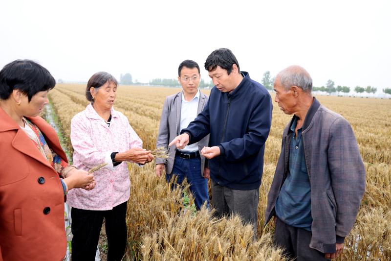 5月29日,郸城县农业农村局农技推广研究员王朝亮来到汲冢镇谢寨村,查看降雨对小麦的影响,并为抢收工作提出指导意见。