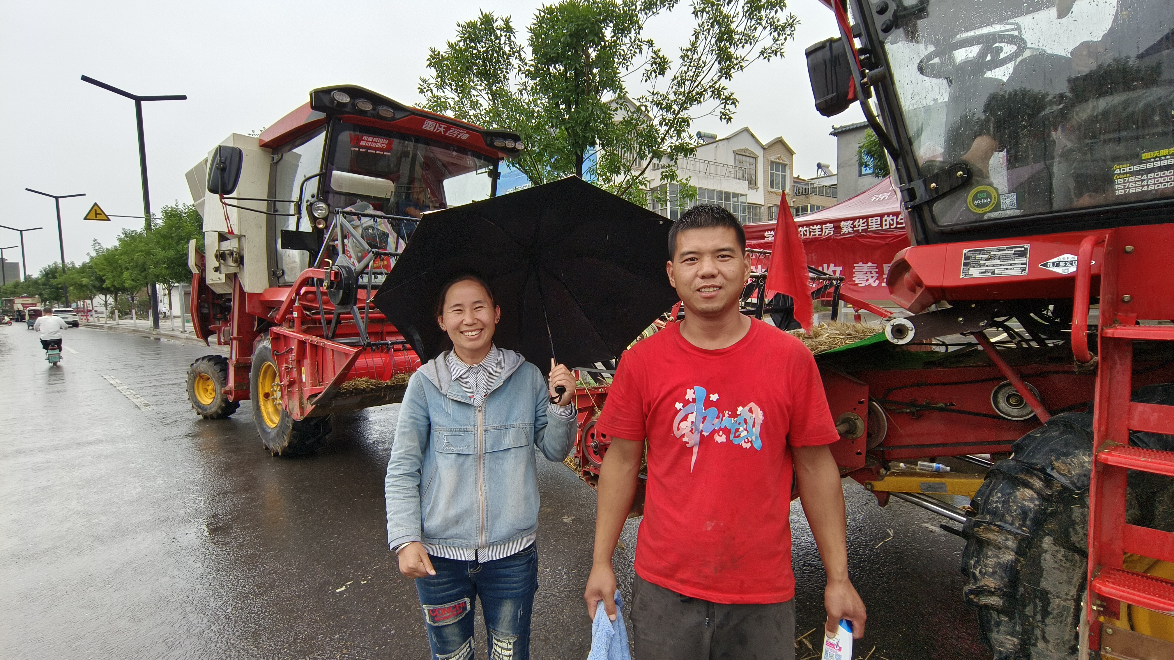 5月30日中午,在商水县平店乡程岗村商水县青禾家庭农场,农场负责人程文喜夫妇正为一台新收割机加水、打黄油,忙里偷闲匆匆端起饭碗扒几口捞面条。