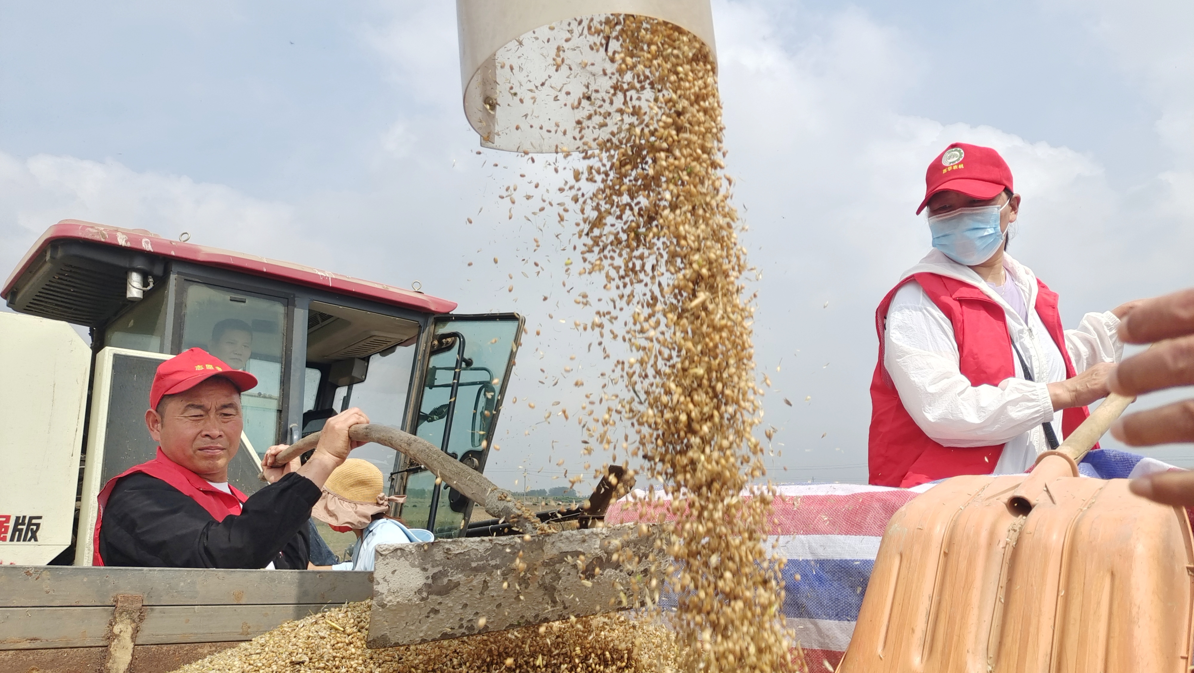 机收现场,履带式收割机下地作业轻松自如,第一户村民的几亩麦子20多分钟就收割完毕,一村民说:“这可解决了农民的大难题!”村民们围着收割机出仓口看看今年的收成到底咋样。“产量不会降,就是今年的麦子有点潮。”另一村民说。