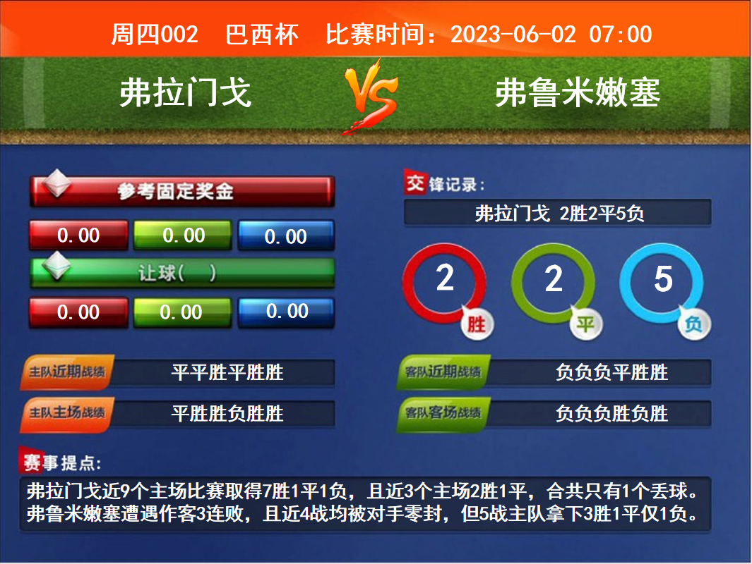 比赛时间:2023-06-02 07:00赛事提点:弗拉门戈近9个主场比赛取得7胜1平1负,且近3个主场2胜1平,合共只有1个丢球。弗鲁米嫩塞遭遇作客3连败,且近4战均被对手零封,但5战主队拿下3胜1平仅1负。