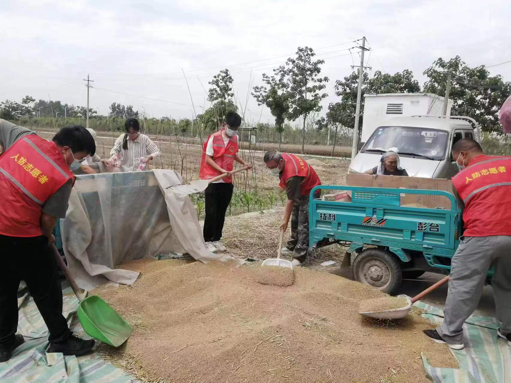 在青庄李双庙村,人防党员干部身着志愿红马甲帮助群众给正在倾倒麦子的收割机铺设雨布;有的拿着秋锹帮着装粮、运粮;有的在铺晒小麦……烈日酷暑伴随着超强的体力付出,让人防志愿者们汗如雨下,衣服湿了又干,干了又湿。各个地块随处都能见到人防志愿者不停地忙碌着,流动的红马甲在金色的麦田里成为夏日里一道亮丽的风景线。