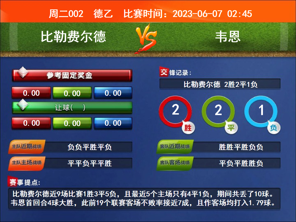 赛事提点:比勒费尔德近9场比赛1胜3平5负,且最近5个主场只有4平1负,期间共丢了10球。韦恩首回合4球大胜,此前19个联赛客场不败率接近7成,且作客场均打入1.79球。