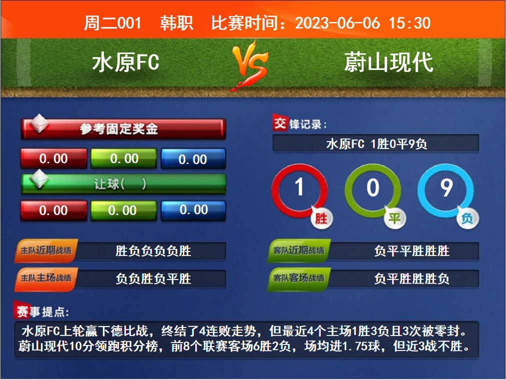 比赛时间:2023-06-06 15:30赛事提点:水原FC上轮赢下德比战,终结了4连败走势,但最近4个主场1胜3负且3次被零封。蔚山现代10分领跑积分榜,前8个联赛客场6胜2负,场均进1.75球,但近3战不胜。