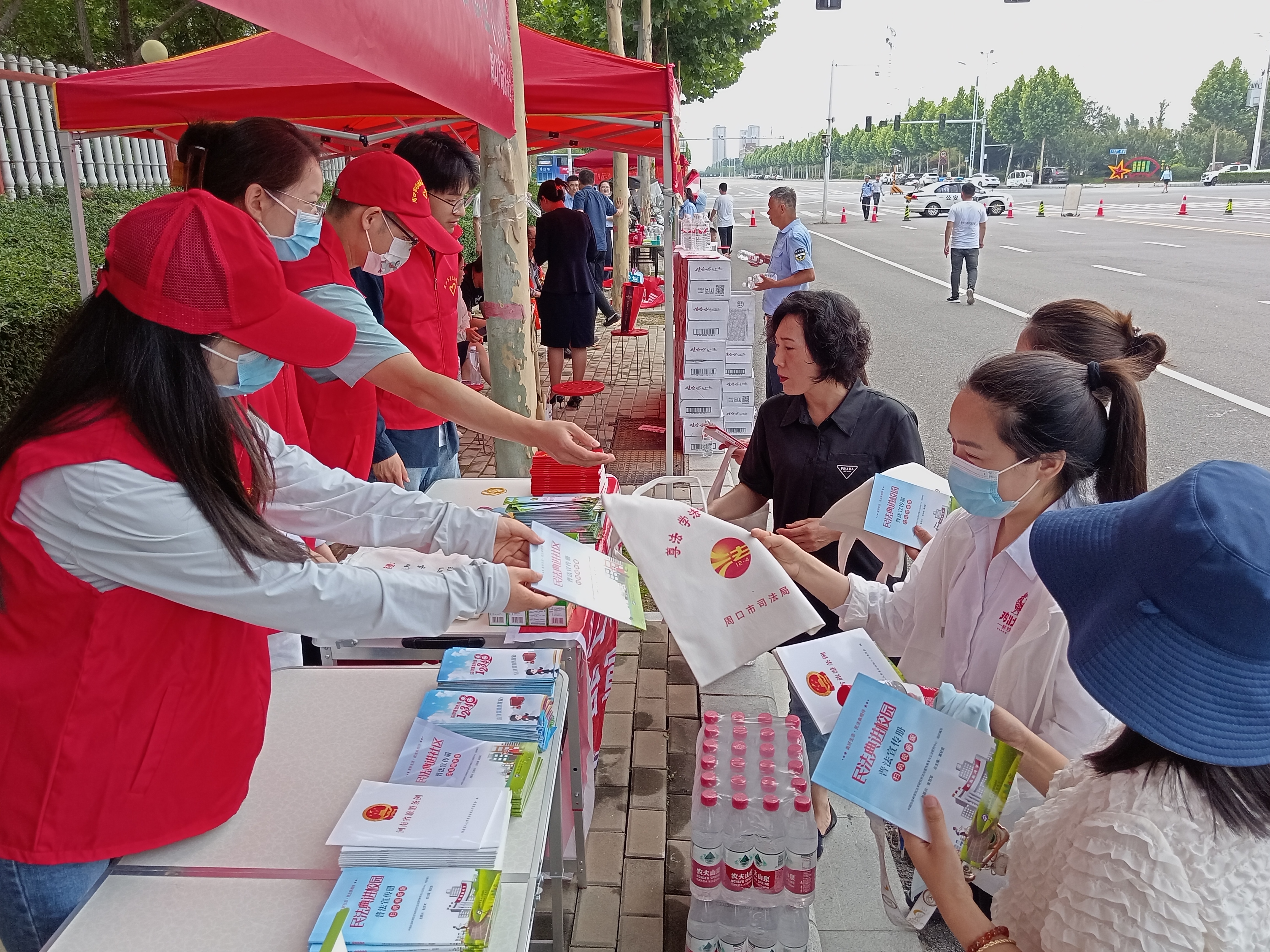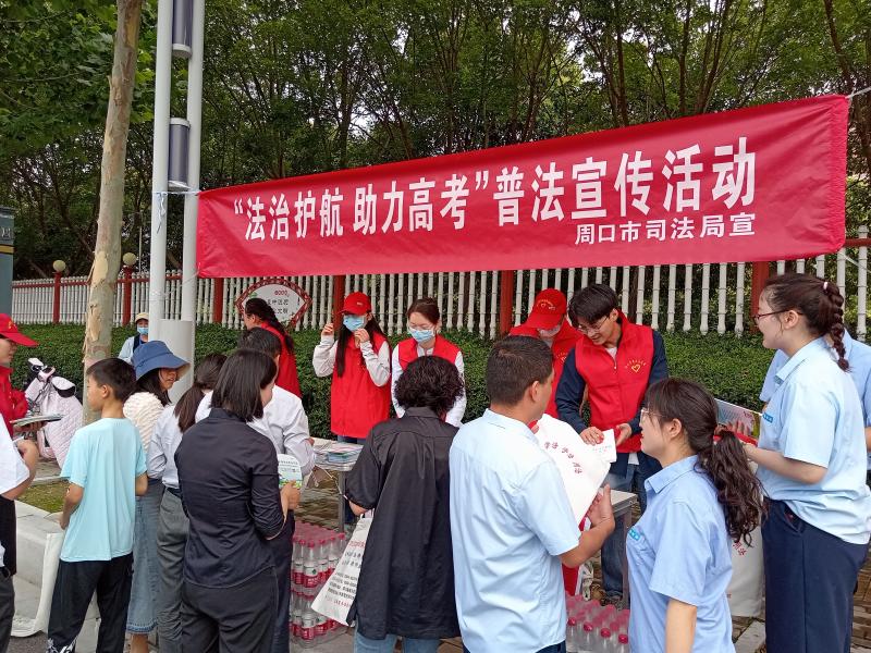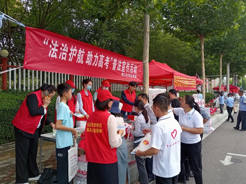 6月7日,在周口市文昌中学高考考点外,市司法局志愿者开展普法宣传教育活动,倾情助力高考,向家长发放民法典宣传手册、普法手提袋等,讲解法律知识,增强家长和考生的法治意识。