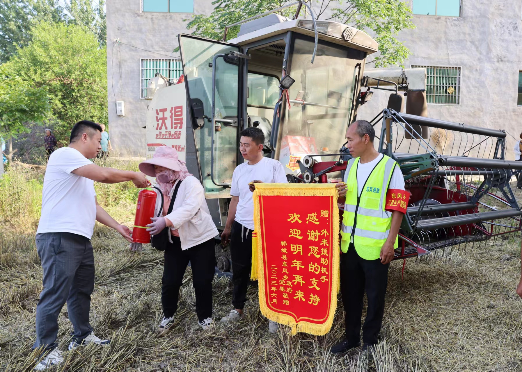 “我是山东菏泽的收割机手葛文中,5月31日来到东风乡杨庄村,乡里村里包吃包住,每天把饭送到地头。现在杨庄村1500亩地全部收完了,乡里还给俺送了锦旗和慰问品。郸城真是个好地方,明年收麦俺还来。”6月6日12时15分,随着东风乡杨庄行政村最后一垄麦收割完毕,乡包村干部、村党支部书记为其送上了锦旗、灭火器、方便面和矿泉水,机手葛文中激动地表示明年还来。