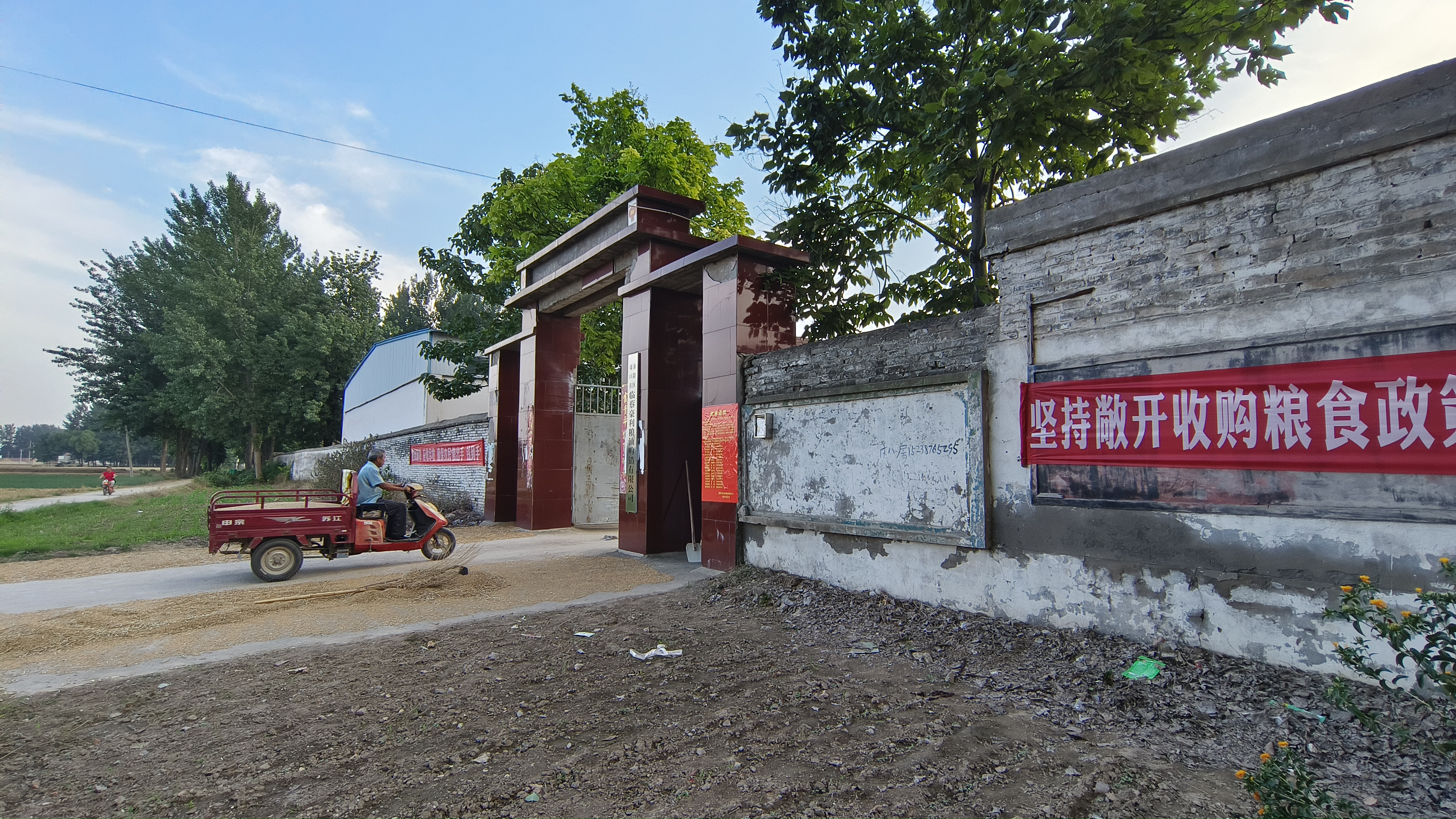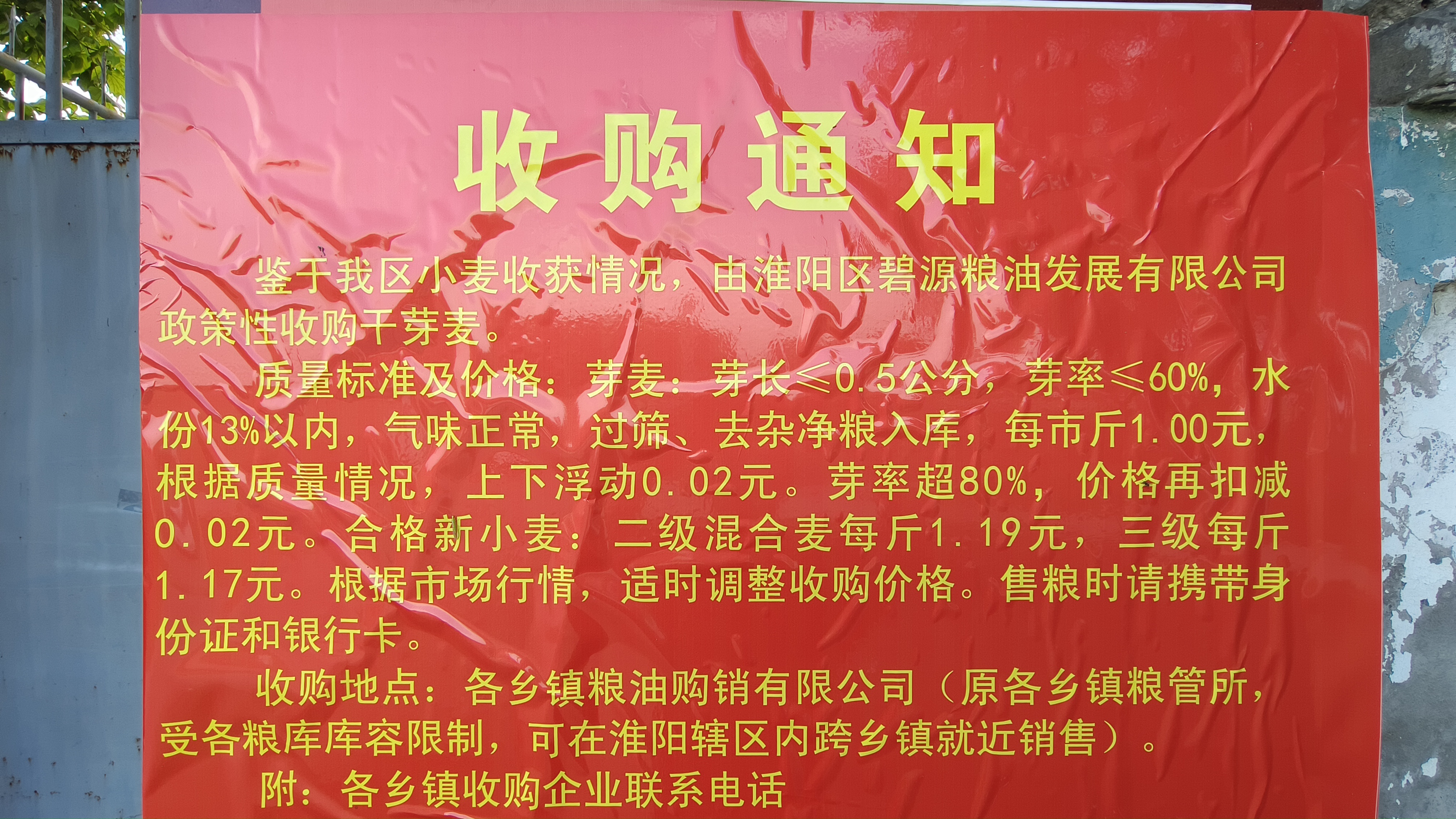 6月7日,一位农民拉着小麦来到淮阳区临蔡豪利粮油购销有限公司售卖。公司门前张贴着收购通知。