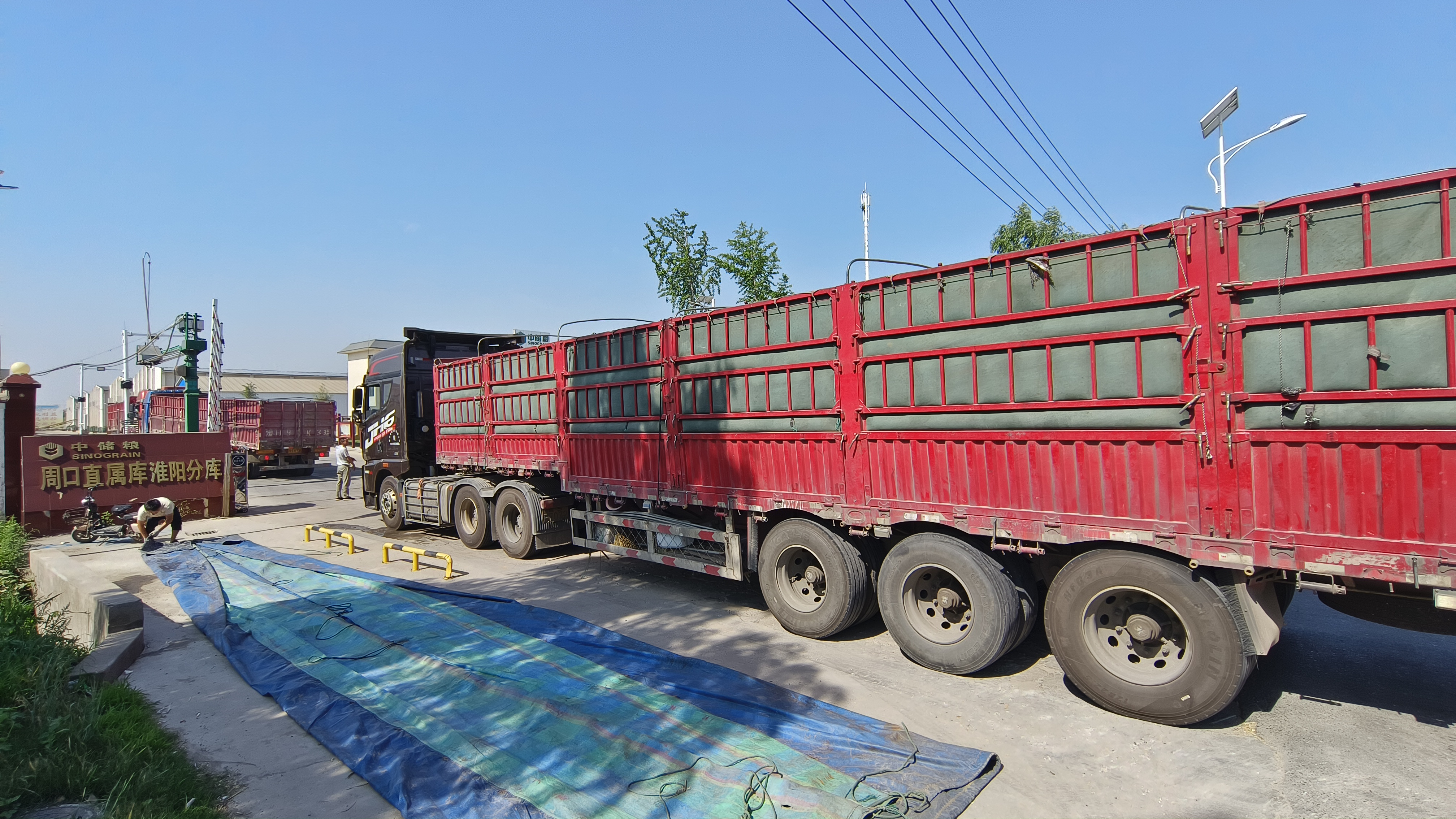 6月8日,一辆装满小麦的货车正在中储粮周口直属库淮阳分库门前等待检测入库。