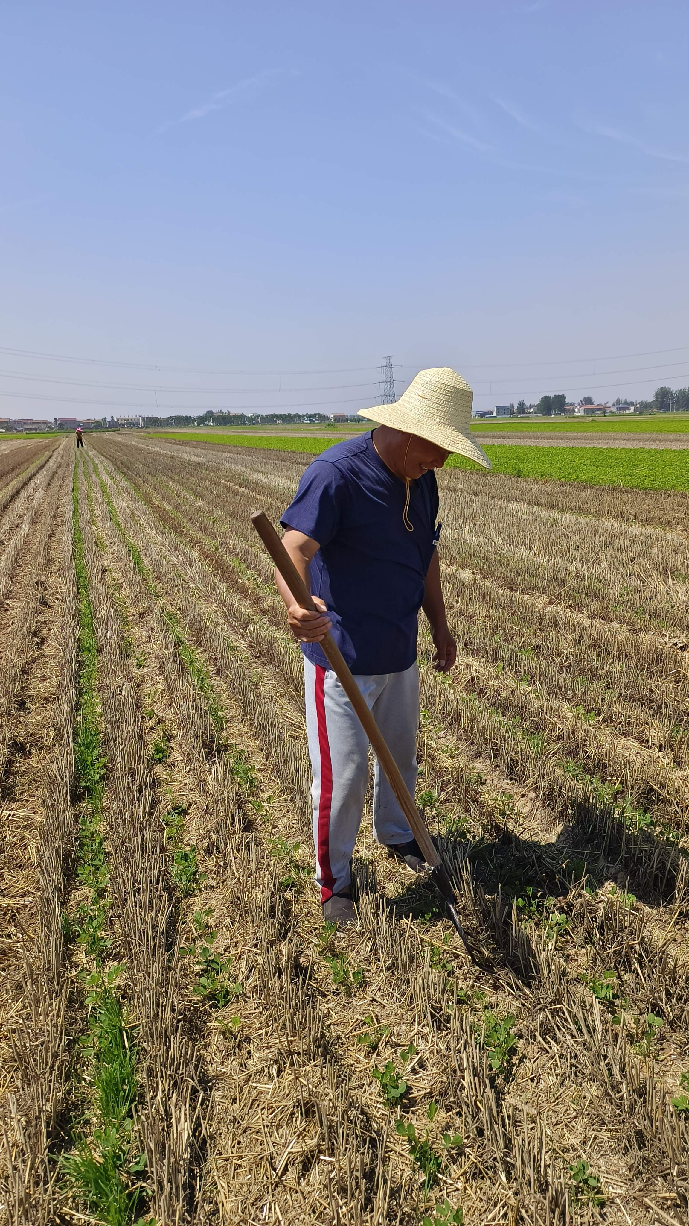 6月8日,淮阳区王店街道办事处周庄村民正在麦茬花生地里松土。