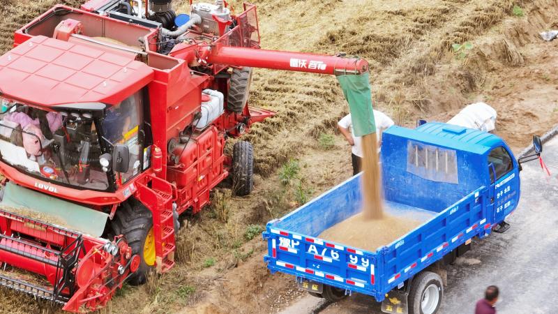 6月2日下午3时许,天空已经阴沉下来,不时有零星小雨滴落。许湾办事处石庄行政村村民肖士礼站在自家的地头上,注视着收割机来来往往,机器发出隆隆的轰鸣声,格外响亮。收割机驶过,“麦浪”逐渐消失,伴随着收割机尾部吐出的碎末,秸秆铺成一条条小路。满仓后,麦粒从收割机里跳跃而出,堆起一座座小山。“手里有粮心里不慌。顺利收了,我这心也不吊着了。”肖士礼眉头紧皱,旁边陪伴着他的村干部和驻村第一书记石彦龙在一旁轻声安慰。
