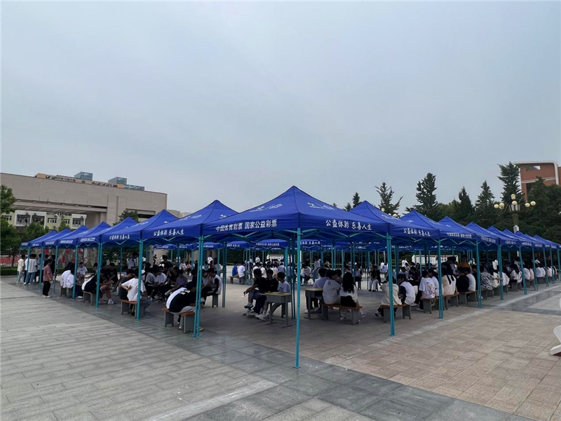 本次活动周口体彩分中心协调到40余顶帐篷,在考场外设置服务点为考生及家长提供饮用水、歇息区。结合周口市文昌中学实际情况,在考场校园内搭设一整片体彩遮阳帐篷阴凉区域,为考生候场提供一片“清凉”。 与此同时,体彩志愿者热情地为考生及家长提供爱心服务,送上一瓶瓶清凉的矿泉水,带着满满的爱心与祝福,给莘莘学子们加油助威,让他们切身感受到体彩人的担当和真挚的关爱。