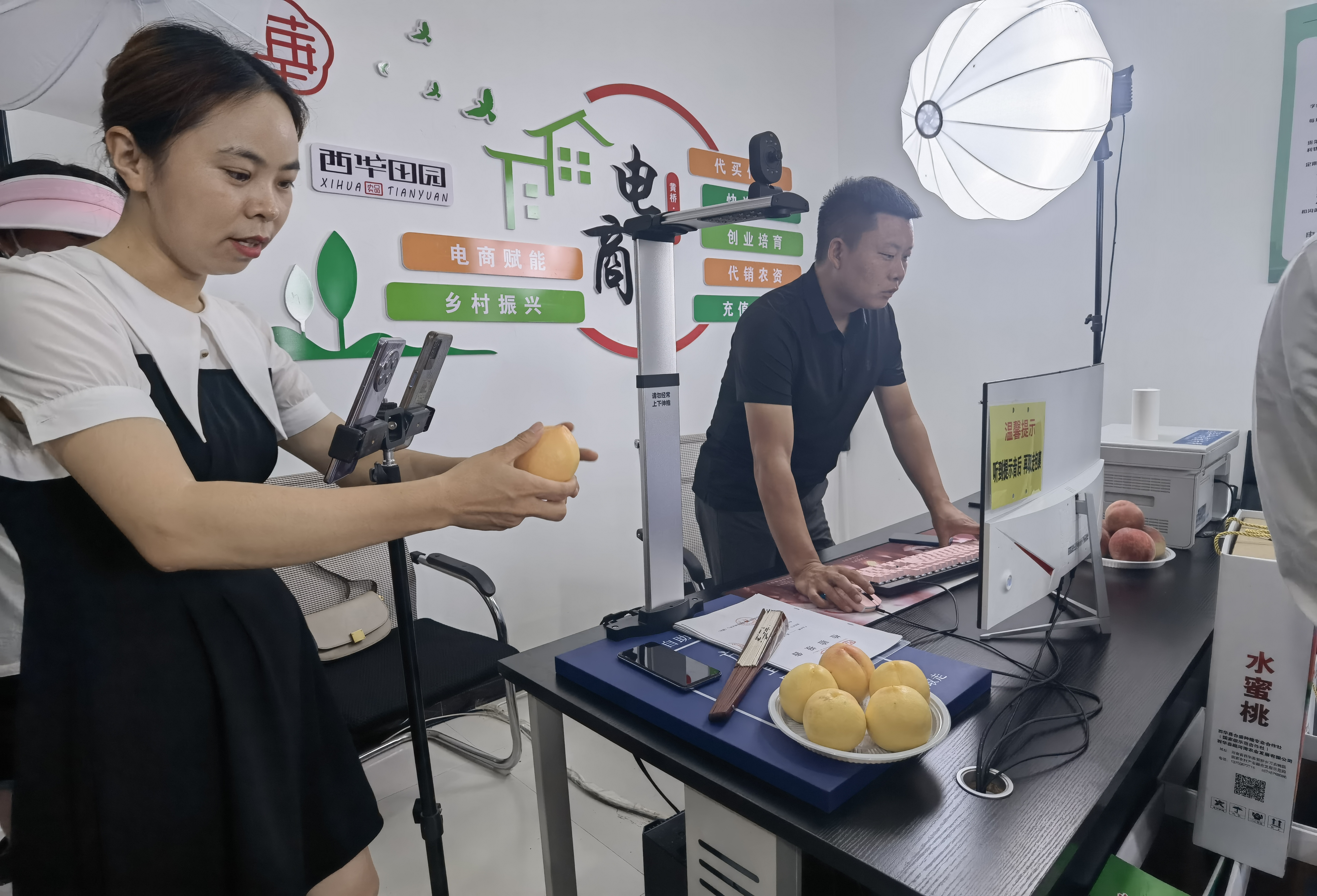 6月13日,西华县黄桥乡裴庄电商物流服务站内,电商人员在直播销售水蜜桃。黄桥乡裴庄行政村是西华“万亩桃源”景区核心区、西华县桃花节举办盛地,近年来,该村大力推进“万亩桃源”提升工程,已经成为全省连片种植规模最大、全国品种最多的桃树种植基地。记者 王映摄