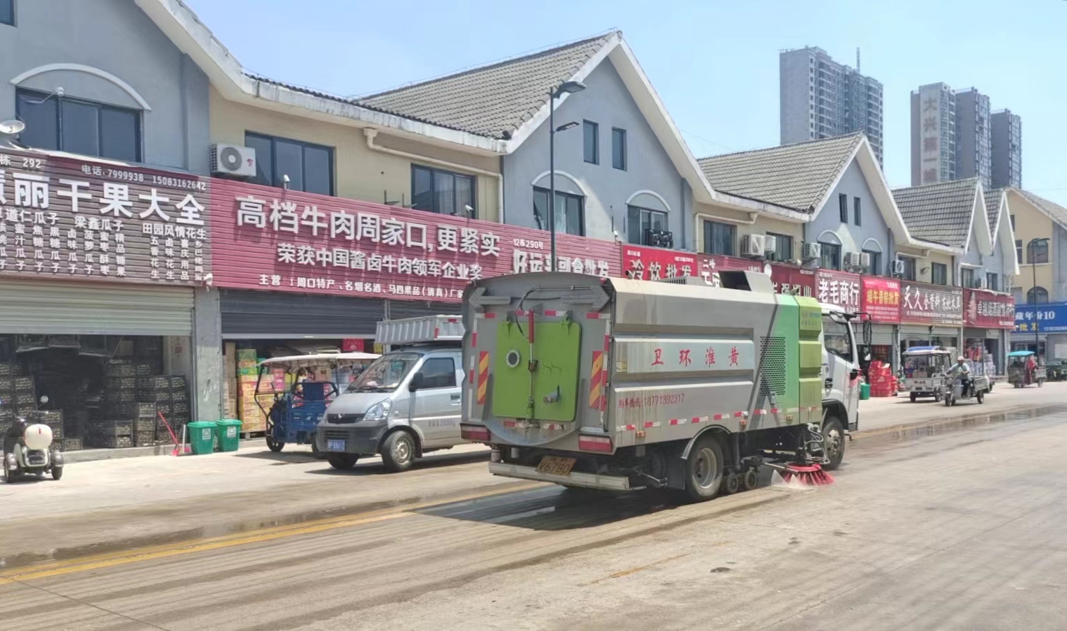标有“黄淮环卫”字样的车辆进行大面积清洁作业