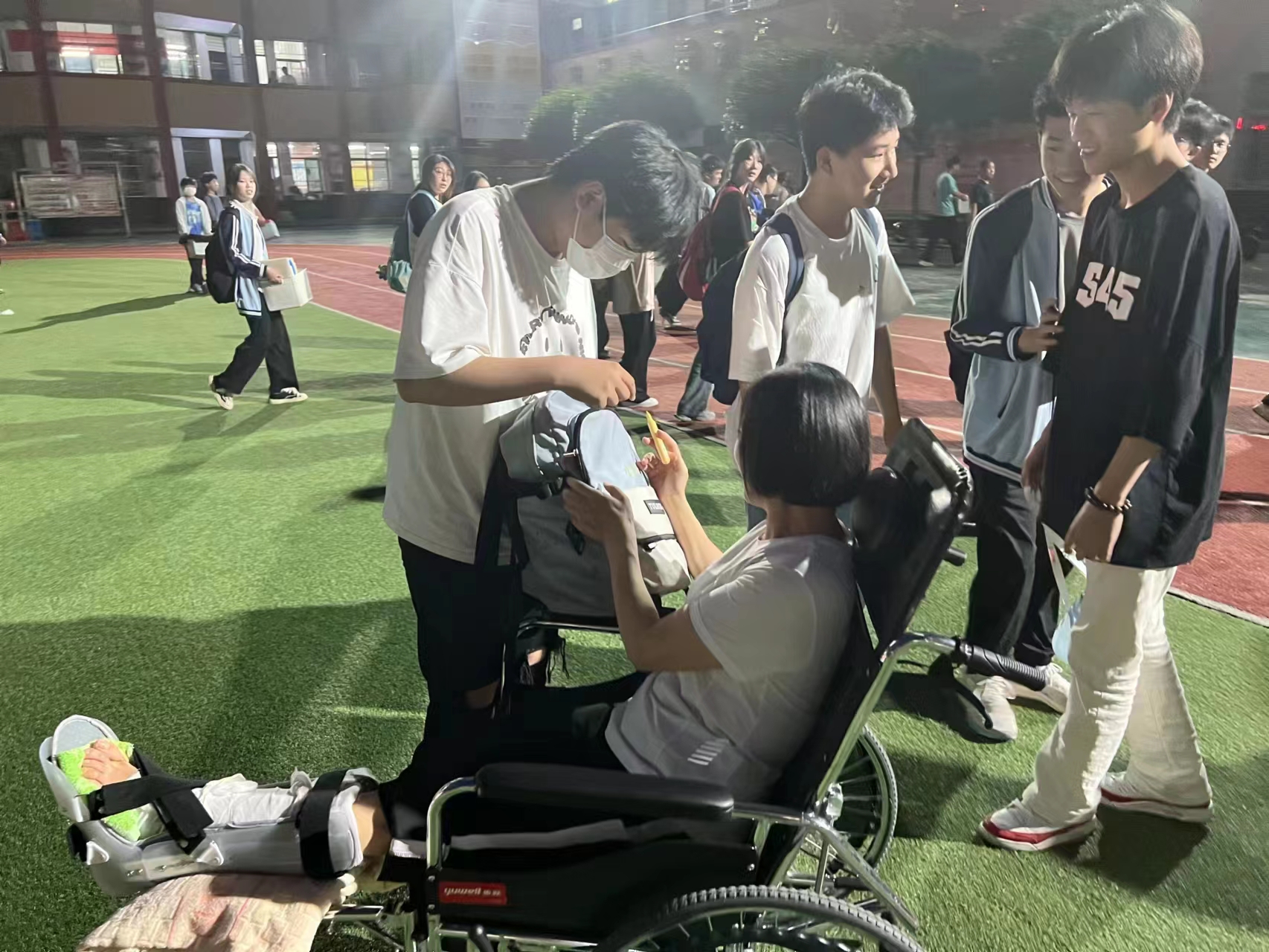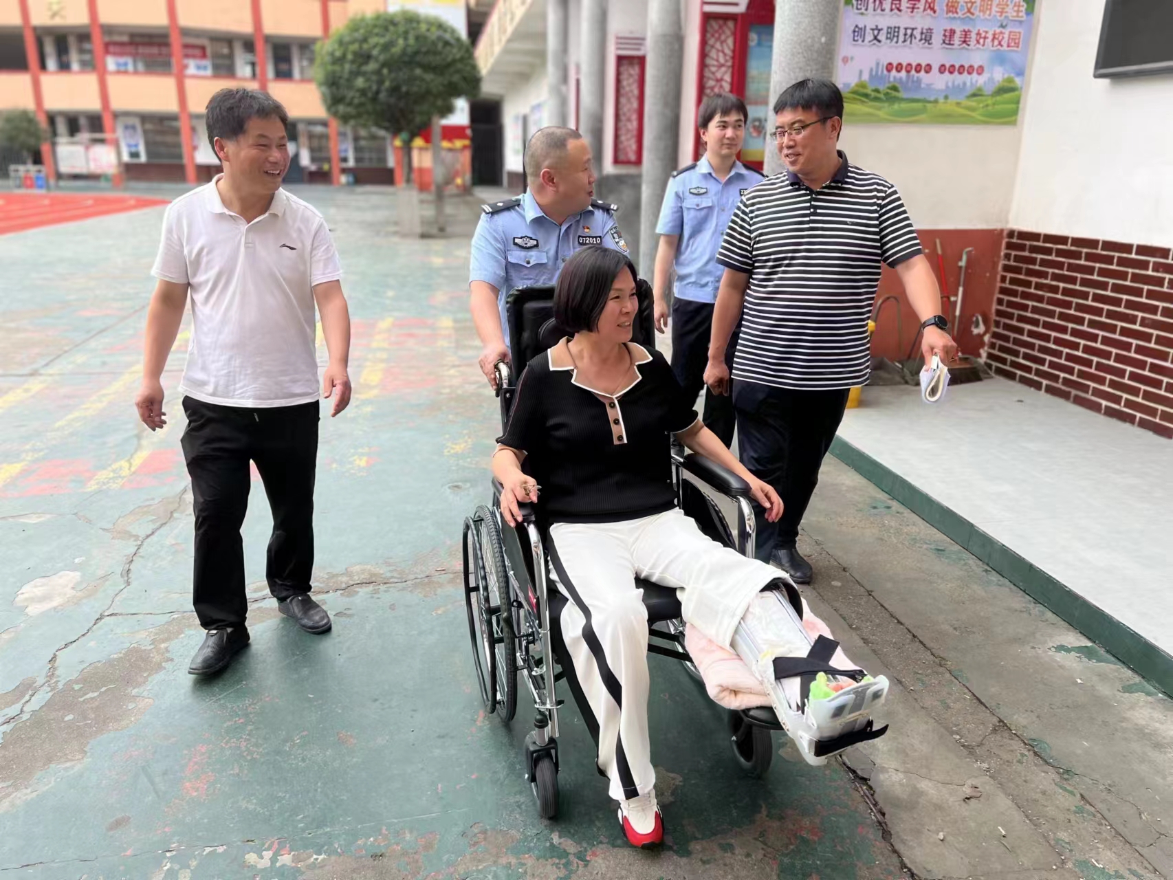 “李校长,您好,您的脚能着地了吗?”“李校长,您辛苦了,您不能站着,赶紧坐下。”6月20日傍晚,李宗莉坐着轮椅来到操场上,为即中考的学子上心理辅导课,刚到地点,孩子们就一下子围了过来,向她表达关心。