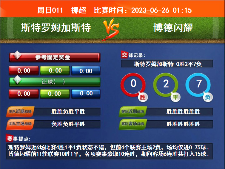 比赛时间:2023-06-26 01:15赛事提点:斯特罗姆近6场比赛4胜1平1负状态不错,但前4个联赛主场2负,场均仅进0.75球。博德闪耀前11轮联赛10胜1平,各项赛事豪取10连胜,期间客场6连胜共打入15球。