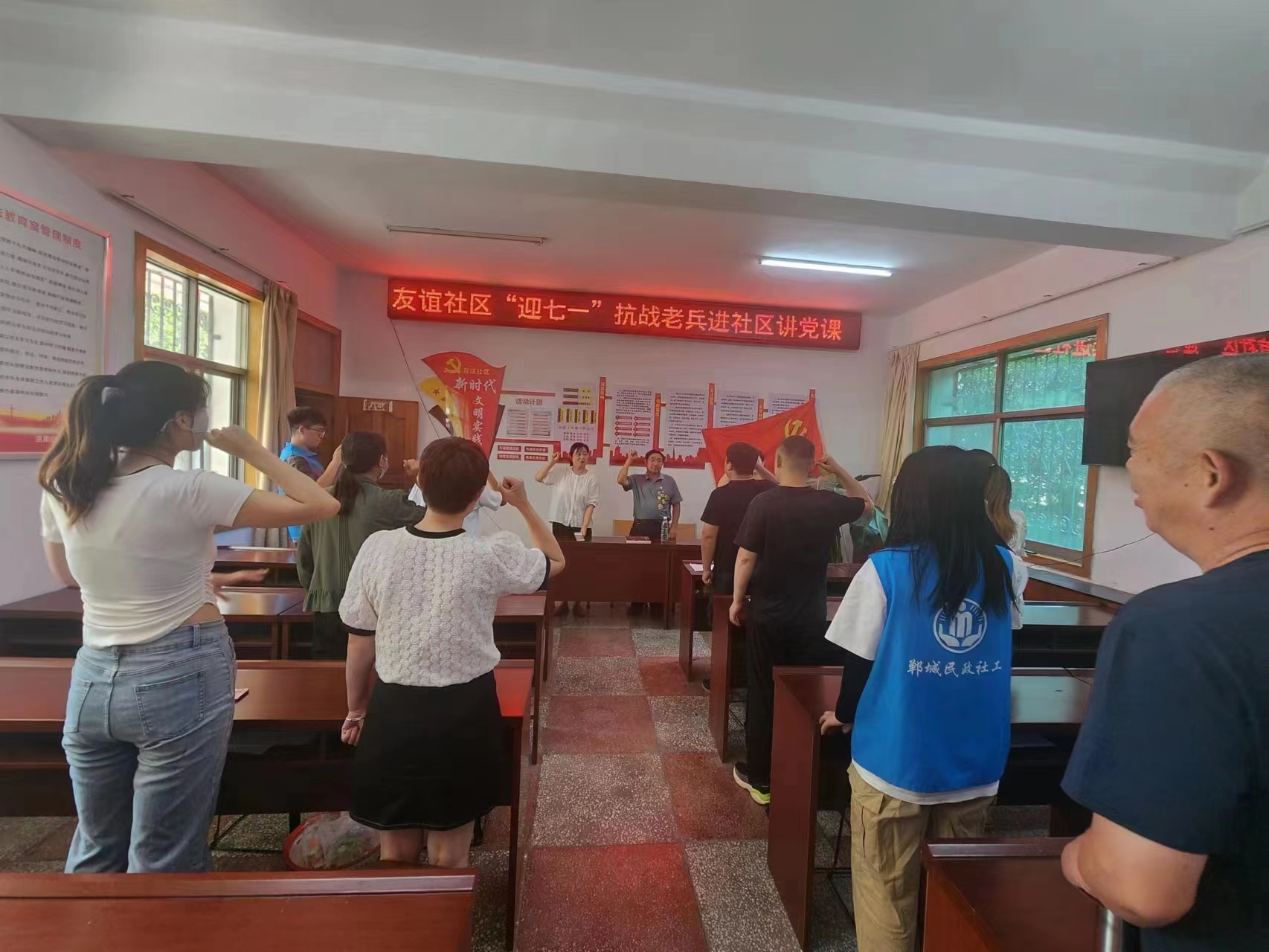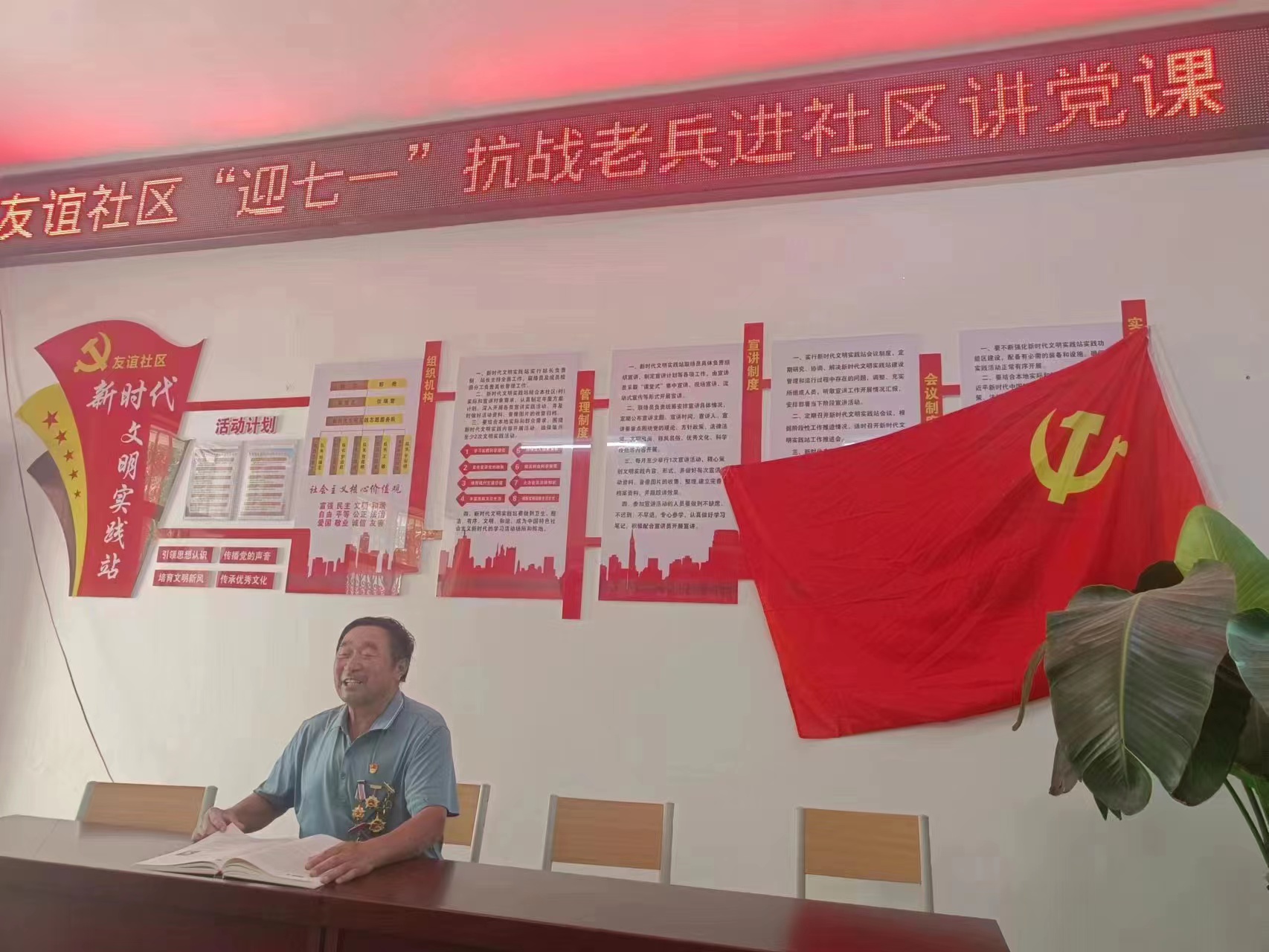 为庆祝中国共产党成立102周年,进一步深化党史学习教育,6月27日,郸城县洺南街道退役军人服务站邀请辖区参战老兵王永全到友谊社区开展“聆听老兵故事、践行入党初心”主题党日活动。