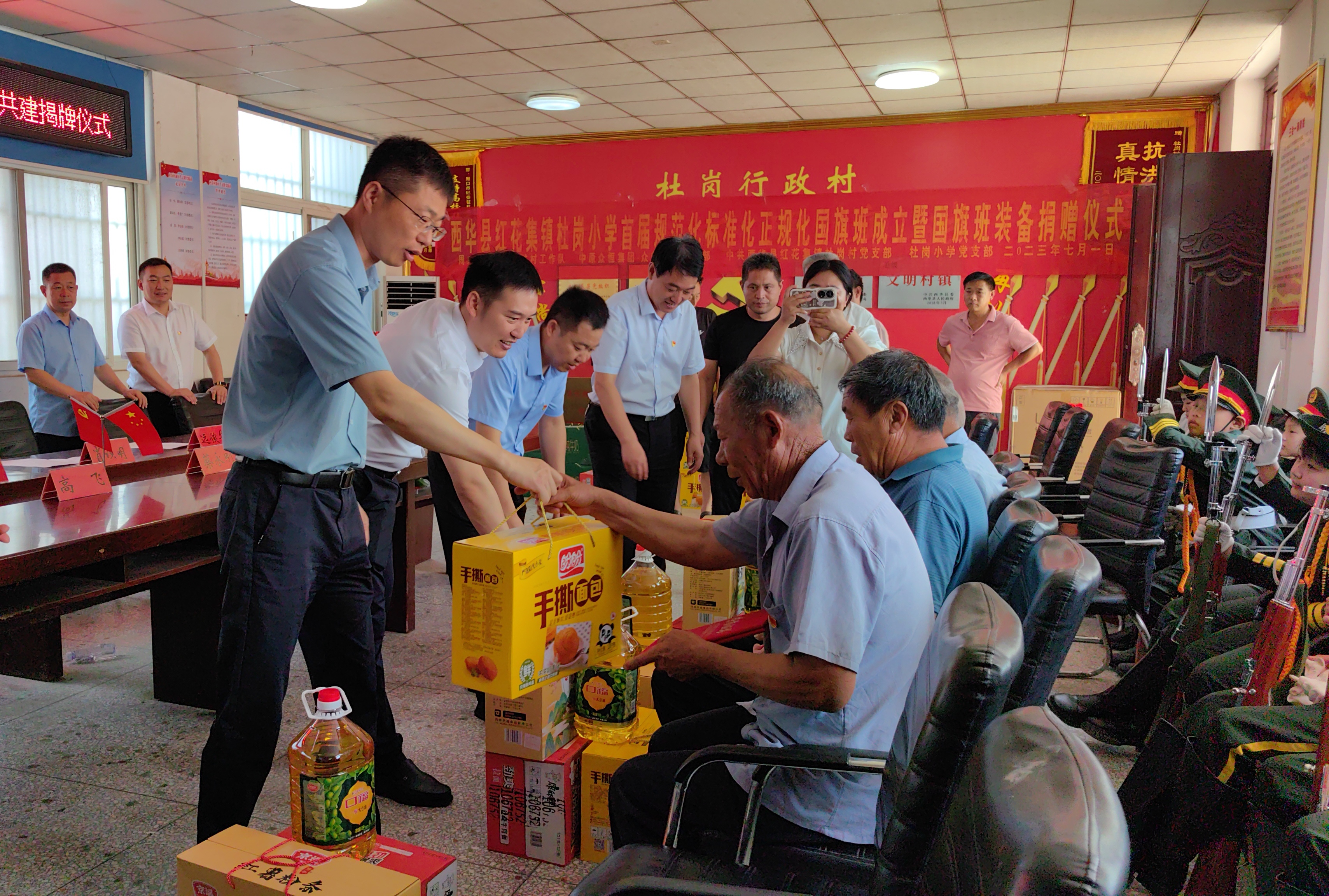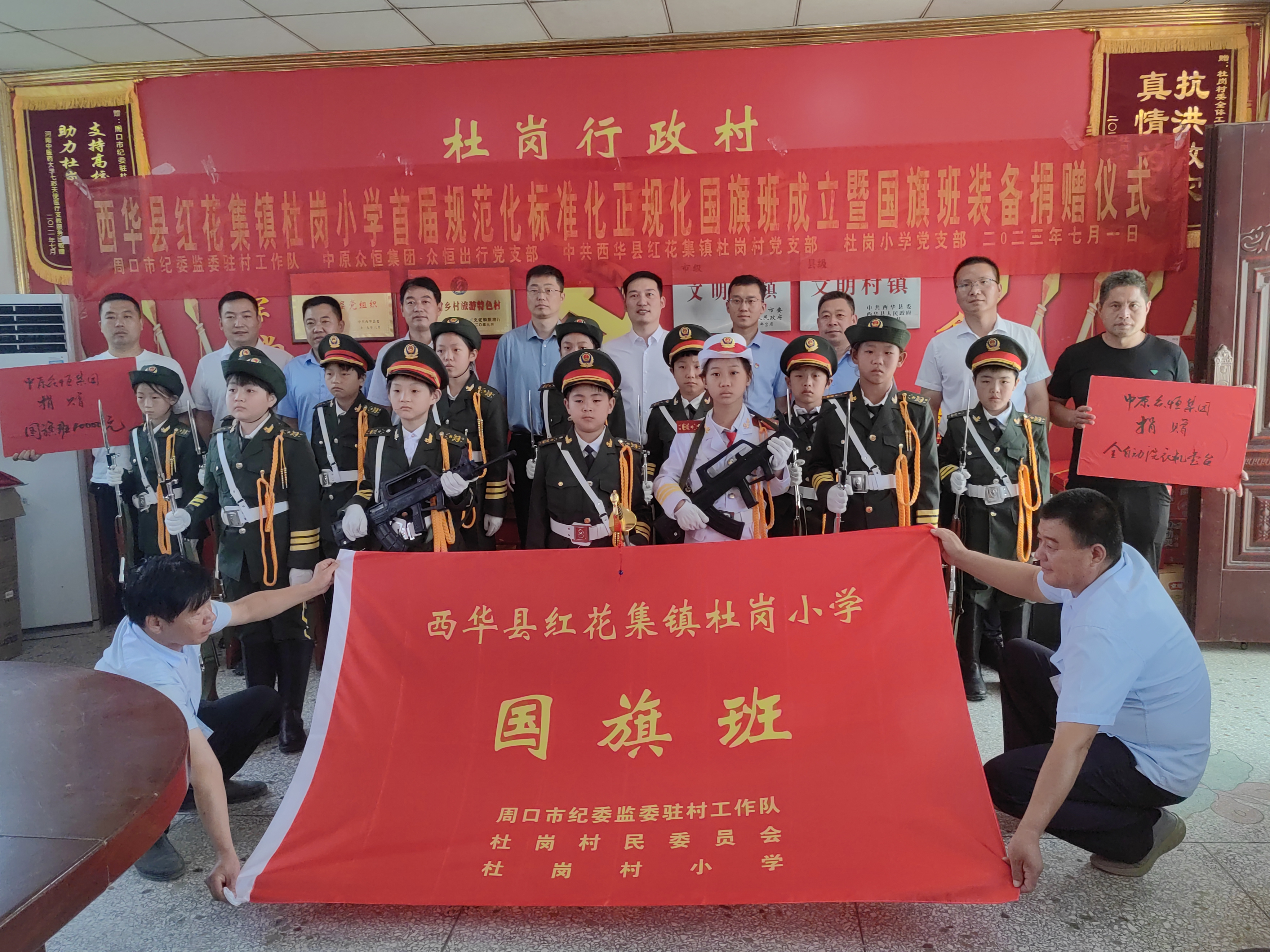 活动现场,众恒集团众恒出行党支部为杜岗小学党支部捐赠10000元成立杜岗小学首届规范化标准化正规化国旗班,河南省人大代表、周口市青联常委、众恒集团董事长王文涛为“杜岗小学首届国旗班”授旗并颁发聘书,希望他们能够传承红色基因,争做新时代好少年。