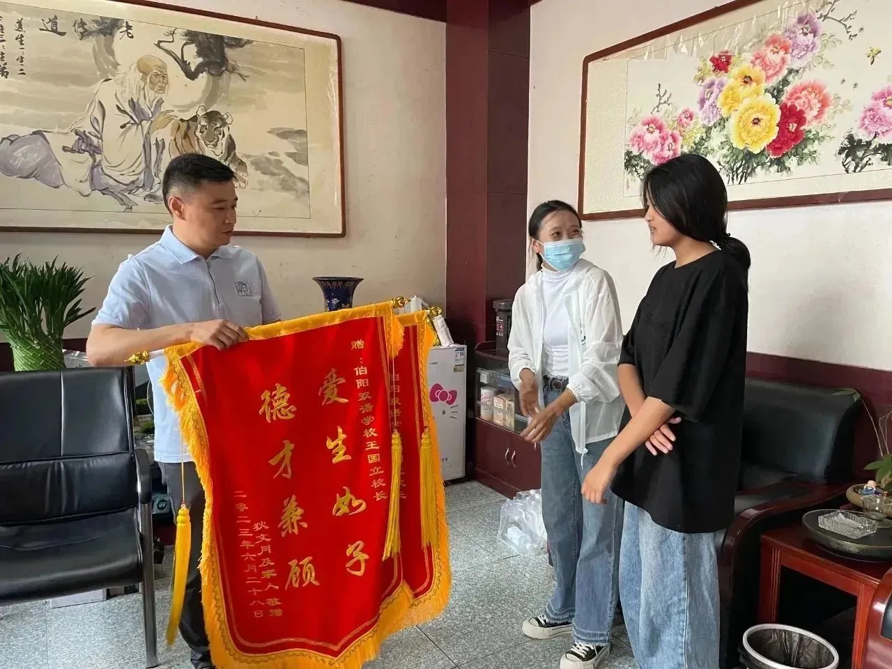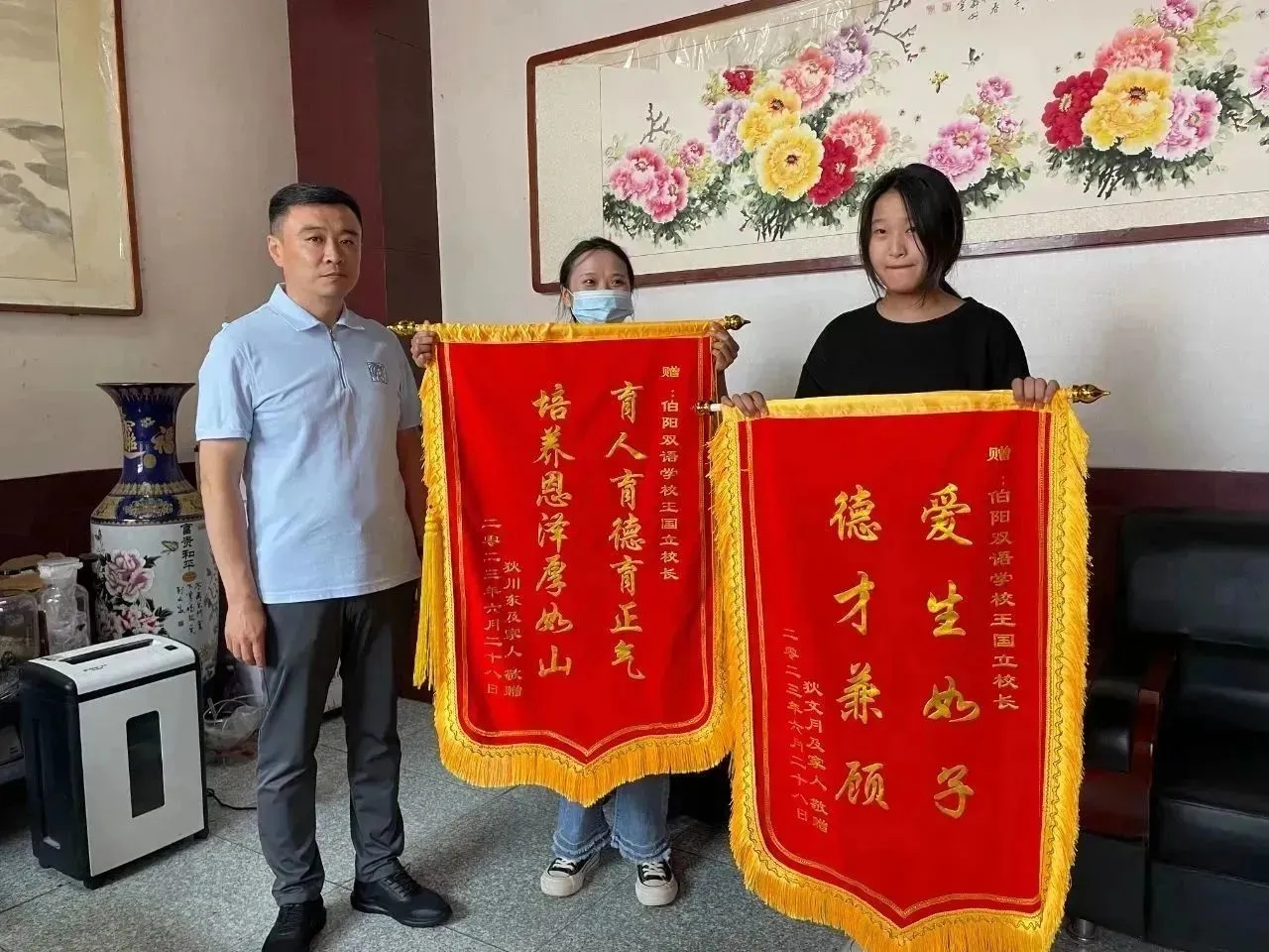 7月4日上午,鹿邑县伯阳中学九年级毕业生狄文月在亲戚陪伴下来到学校,将两面绣着“育人育德育正气 培养恩泽厚如山”“爱生如子 德才兼顾”的锦旗送到校长王国立手中,真诚感谢学校“向日葵”慈善基金对其兄妹二人完成学业的资助。