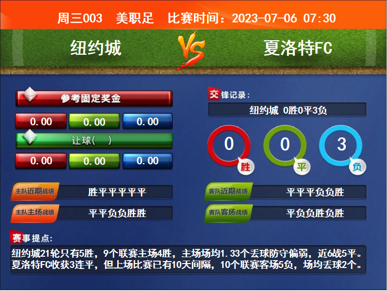 比赛时间:2023-07-06 07:30赛事提点:纽约城21轮只有5胜,9个联赛主场4胜,主场场均1.33个丢球防守偏弱,近6战5平。夏洛特FC收获3连平,但上场比赛已有10天间隔,10个联赛客场5负,场均丢球2个。
