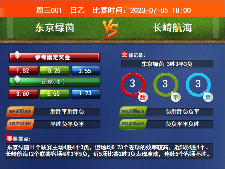 比赛时间:2023-07-05 18:00赛事提点:东京绿茵11个联赛主场4胜4平3负,但场均0.73个丢球的效率较高,近5战4胜1平。长崎航海12个联赛客场4胜3平5负,近5场比赛2胜3负表现波动,连续5个客场不胜。