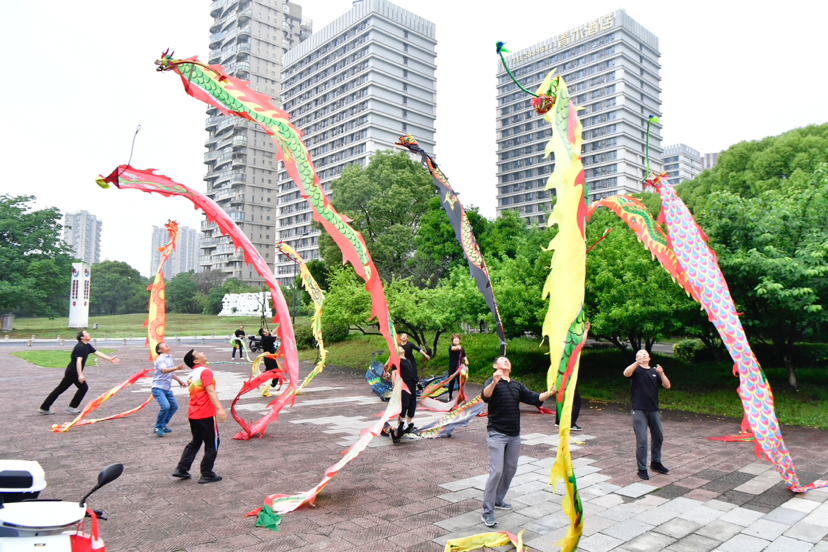 “前8字”“后8字”“腾空飞”“左右开弓”……在杭州市钱塘区金沙湖公园里,一条条色彩各异的“巨龙”在舞龙队员手中腾空而起,他们通过手臂摆动、脚步变动、腰部扭动舞出各种花样,“巨龙”时而左右翻滚、时而昂首挺胸,引得市民驻足观看。