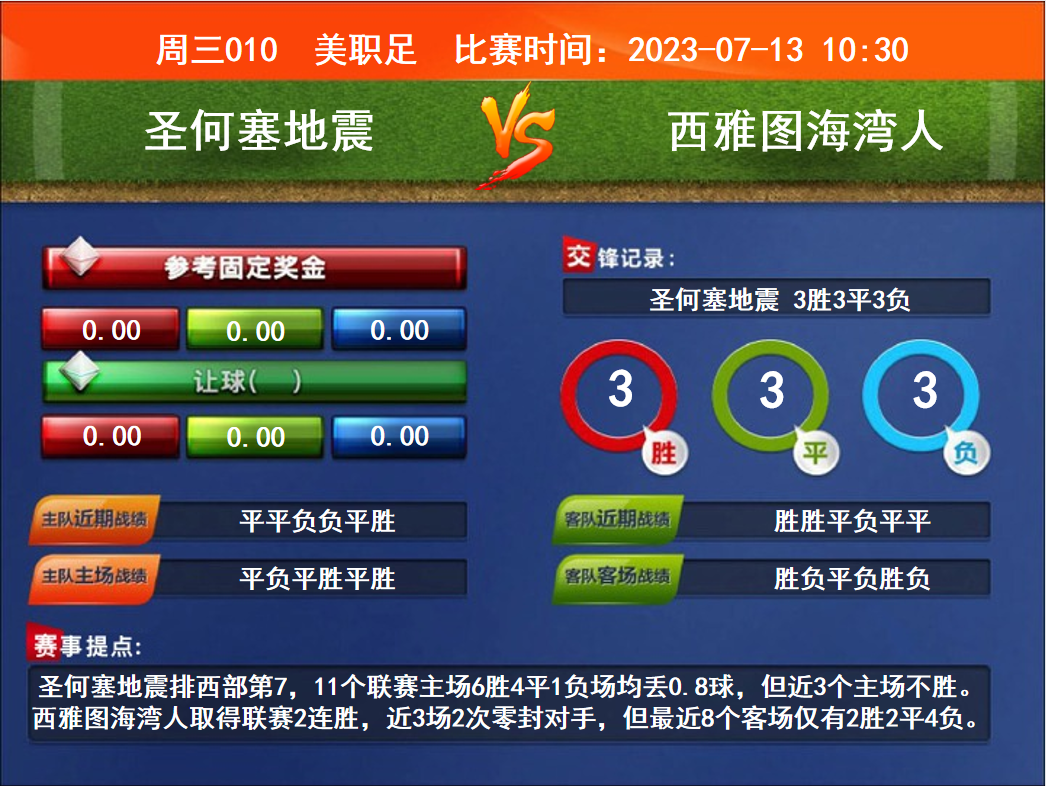 比赛时间:2023-07-13 10:30赛事提点:圣何塞地震排西部第7,11个联赛主场6胜4平1负场均丢0.8球,但近3个主场不胜。西雅图海湾人取得联赛2连胜,近3场2次零封对手,但最近8个客场仅有2胜2平4负。