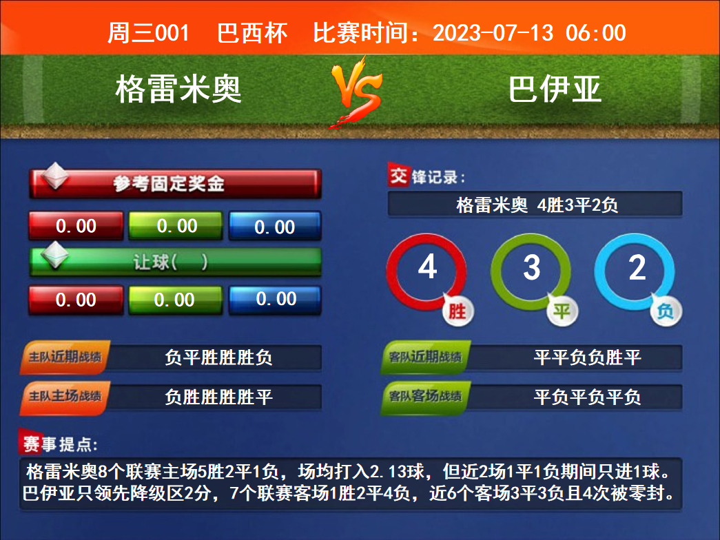 比赛时间:2023-07-13 06:00赛事提点:格雷米奥8个联赛主场5胜2平1负,场均打入2.13球,但近2场1平1负期间只进1球。巴伊亚只领先降级区2分,7个联赛客场1胜2平4负,近6个客场3平3负且4次被零封。