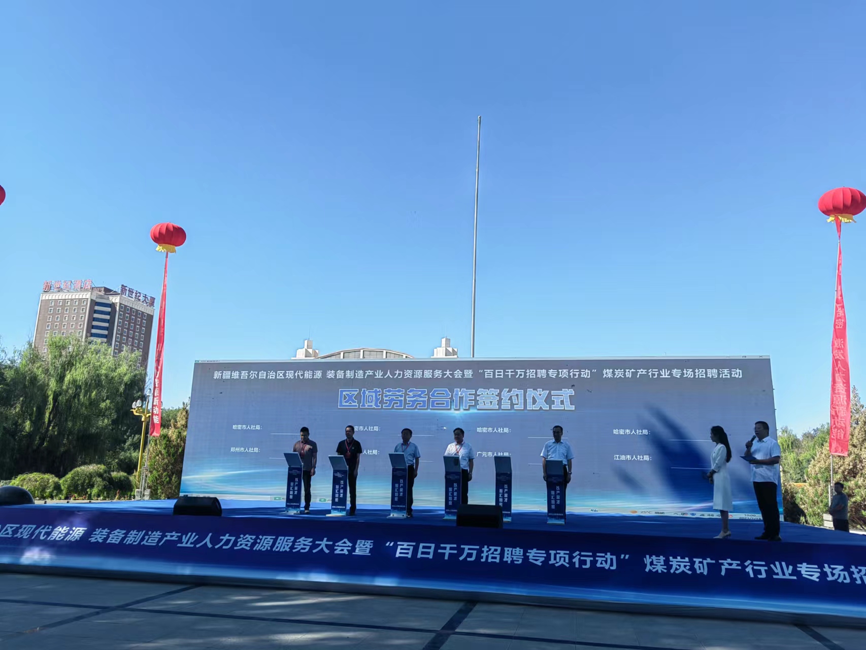 7月13日上午,2023年新疆维吾尔自治区现代能源、装备制造产业人力资源服务大会暨“百日千万招聘专项行动”——煤炭矿产行业专场招聘活动在哈密市伊州区时代广场启动。