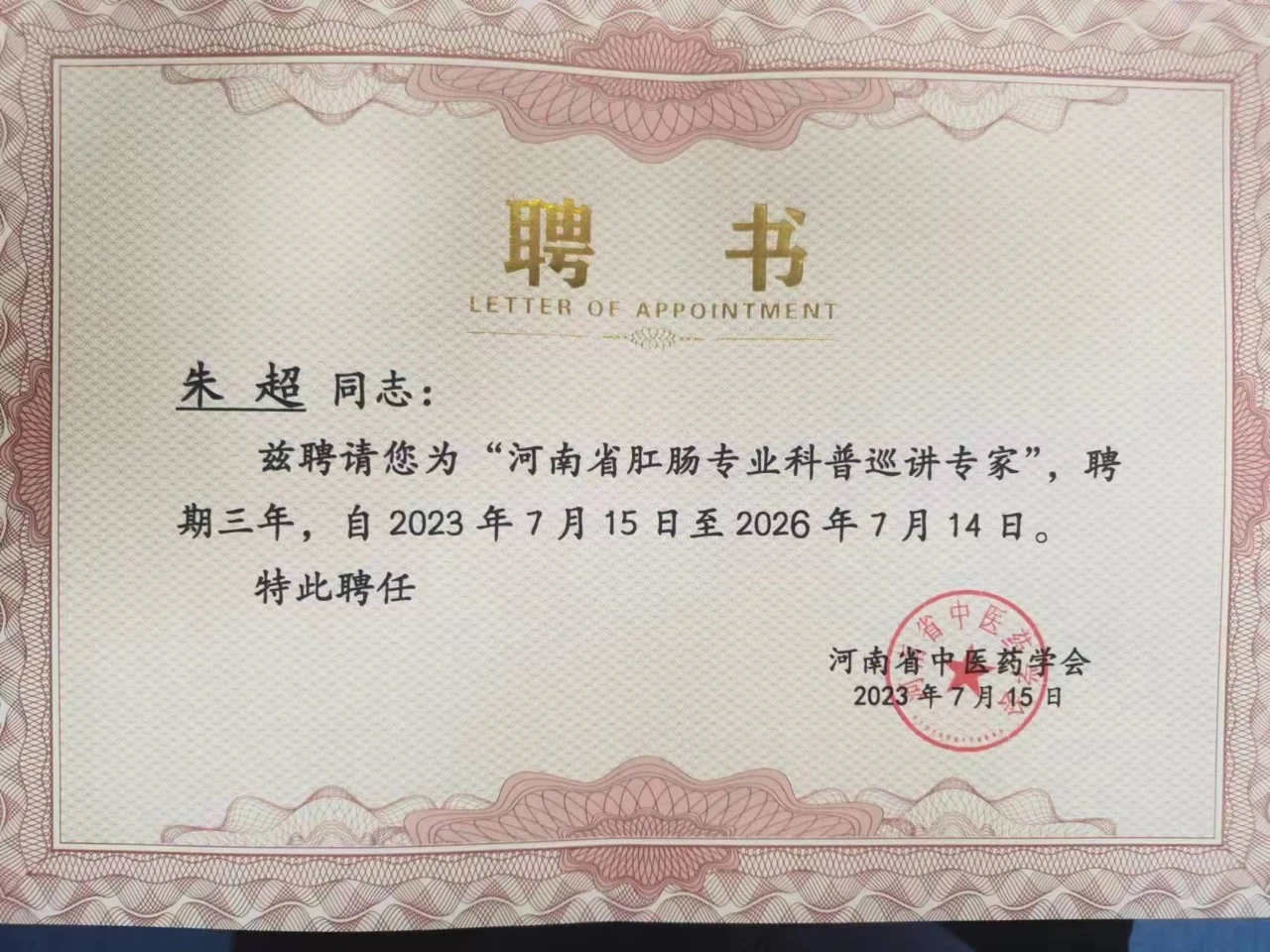 记者从鹿邑县中医院医疗健康服务集团获悉,近日,该县中医院副院长朱超被河南省中医药学会聘任为“河南省肛肠专科科普巡讲专家”。