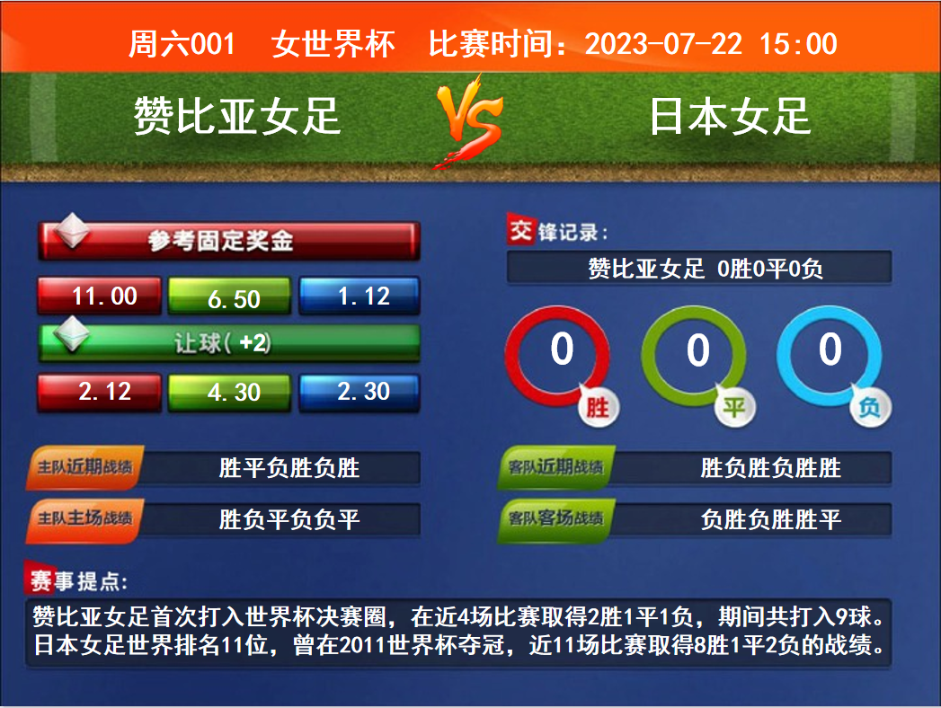 比赛时间:2023-07-22 15:00赛事提点:赞比亚女足首次打入世界杯决赛圈,在近4场比赛取得2胜1平1负,期间共打入9球。日本女足世界排名11位,曾在2011世界杯夺冠,近11场比赛取得8胜1平2负的战绩。