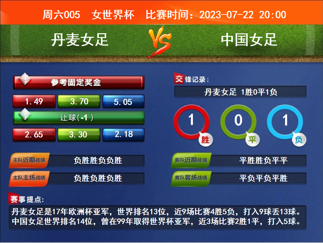 比赛时间:2023-07-22 20:00赛事提点:丹麦女足是17年欧洲杯亚军,世界排名13位,近9场比赛4胜5负,打入9球丢13球。中国女足世界排名14位,曾在99年取得世界杯亚军,近3场比赛2胜1平,打入5球。